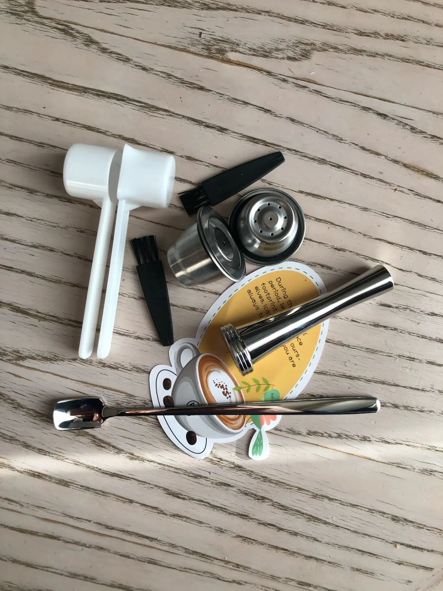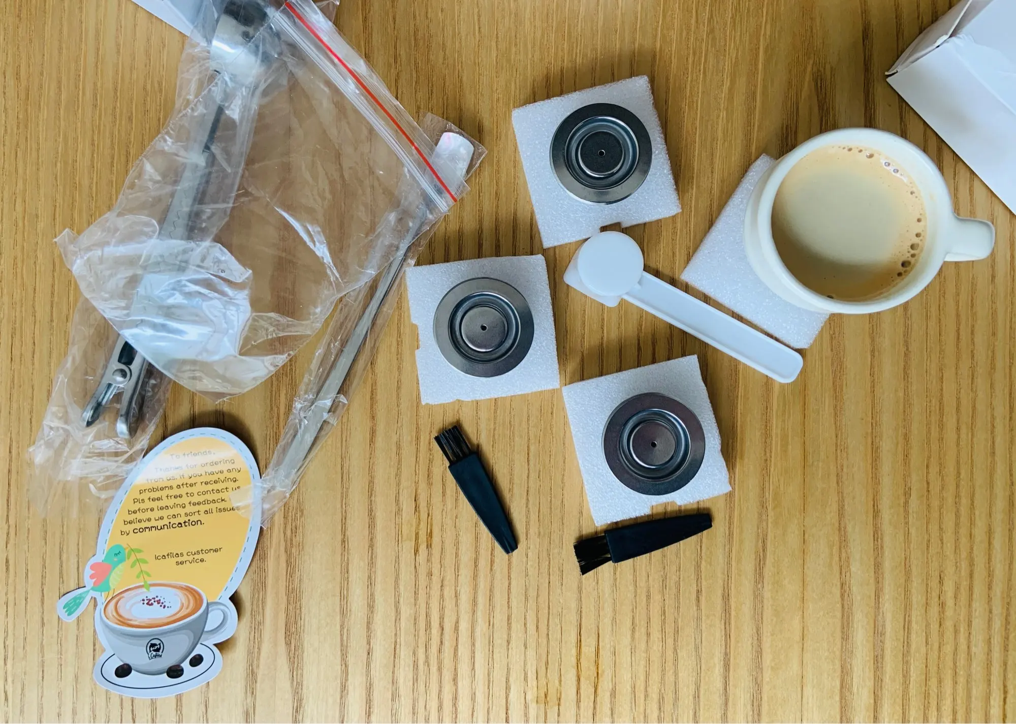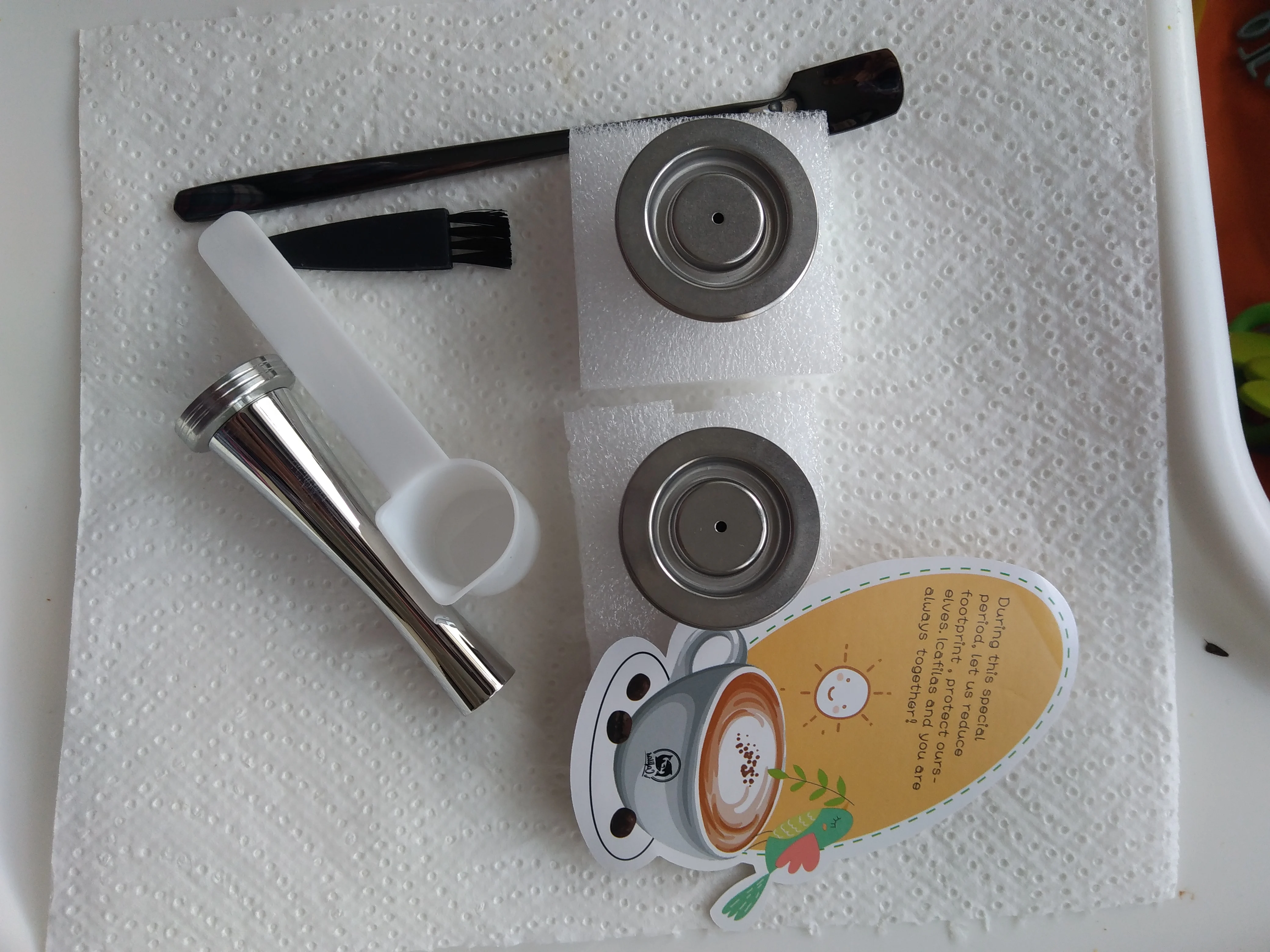 Прибыло в соответствии с расписанием. Упаковка безопасна и все вещи внутри хороши. Попробовал его с Delonghi EN110.B Nespresso U. Результат хороший. Легко чистить капсулу. Спасибо за бонусную ложку, очень красиво и внимателно.