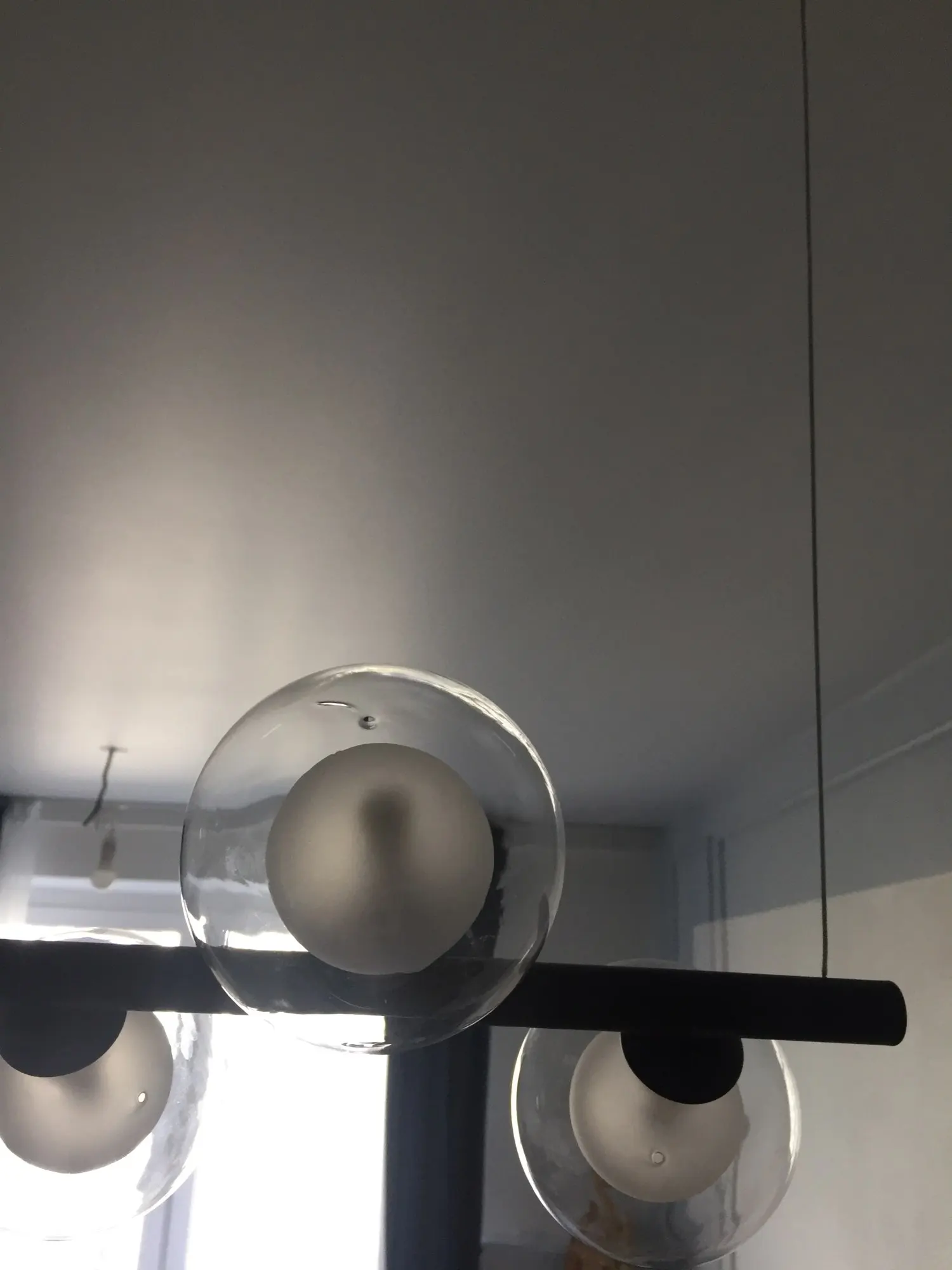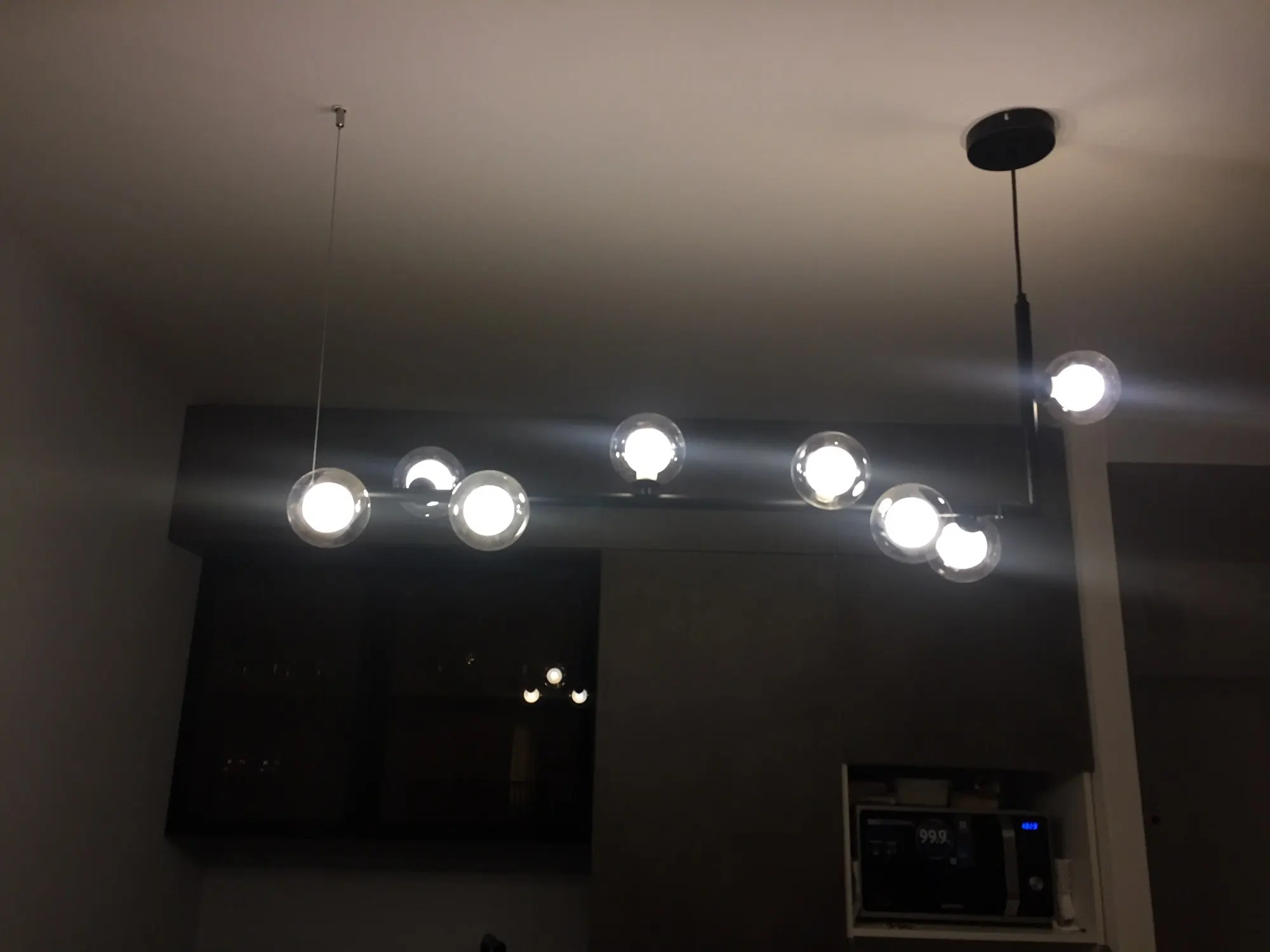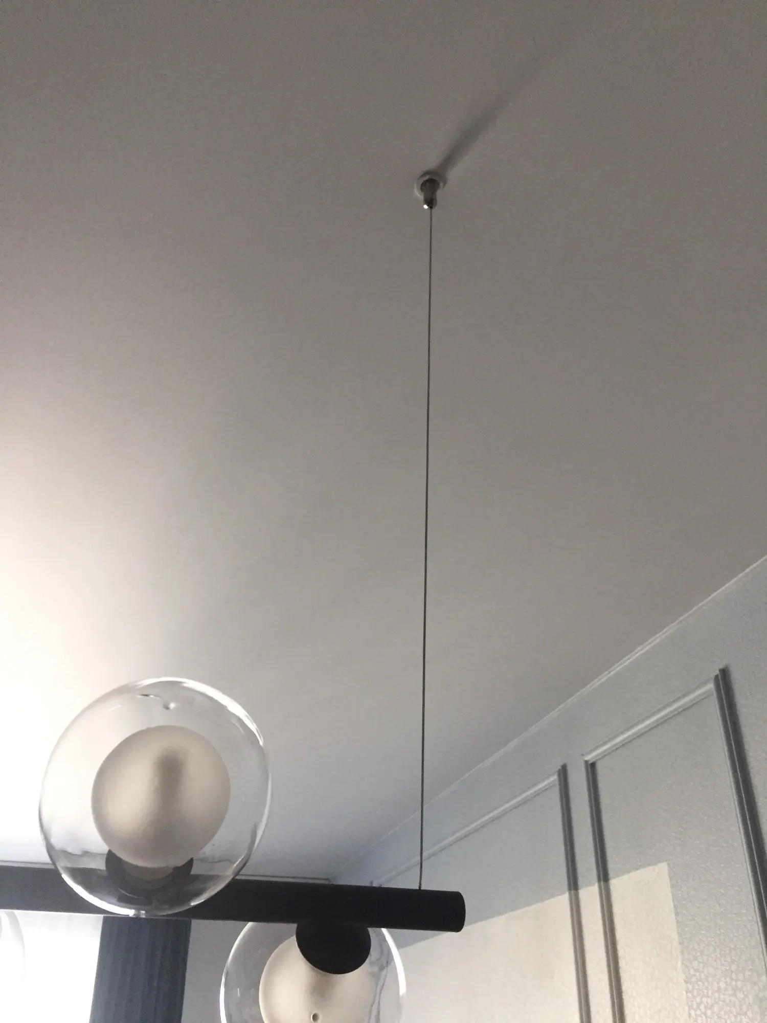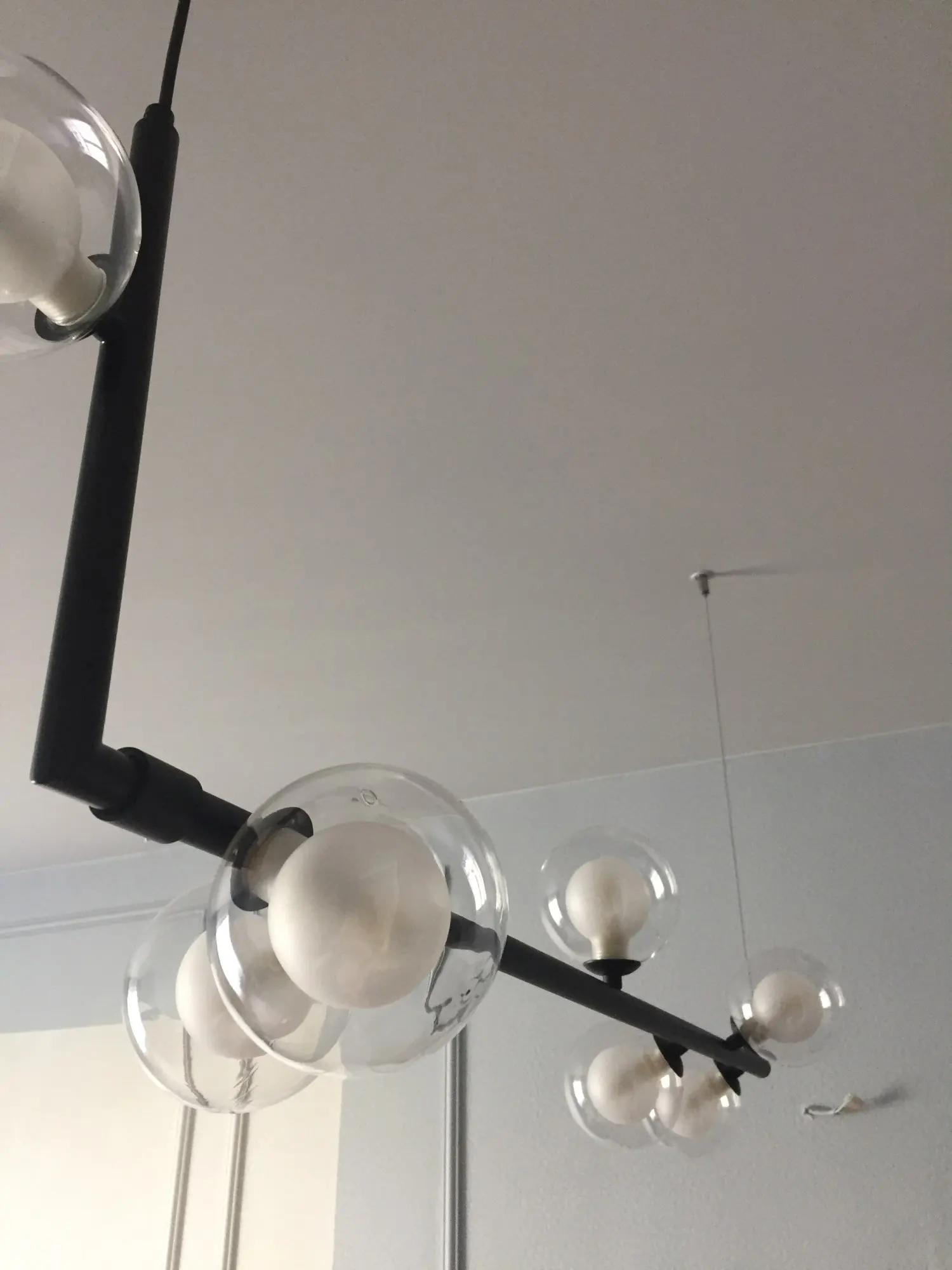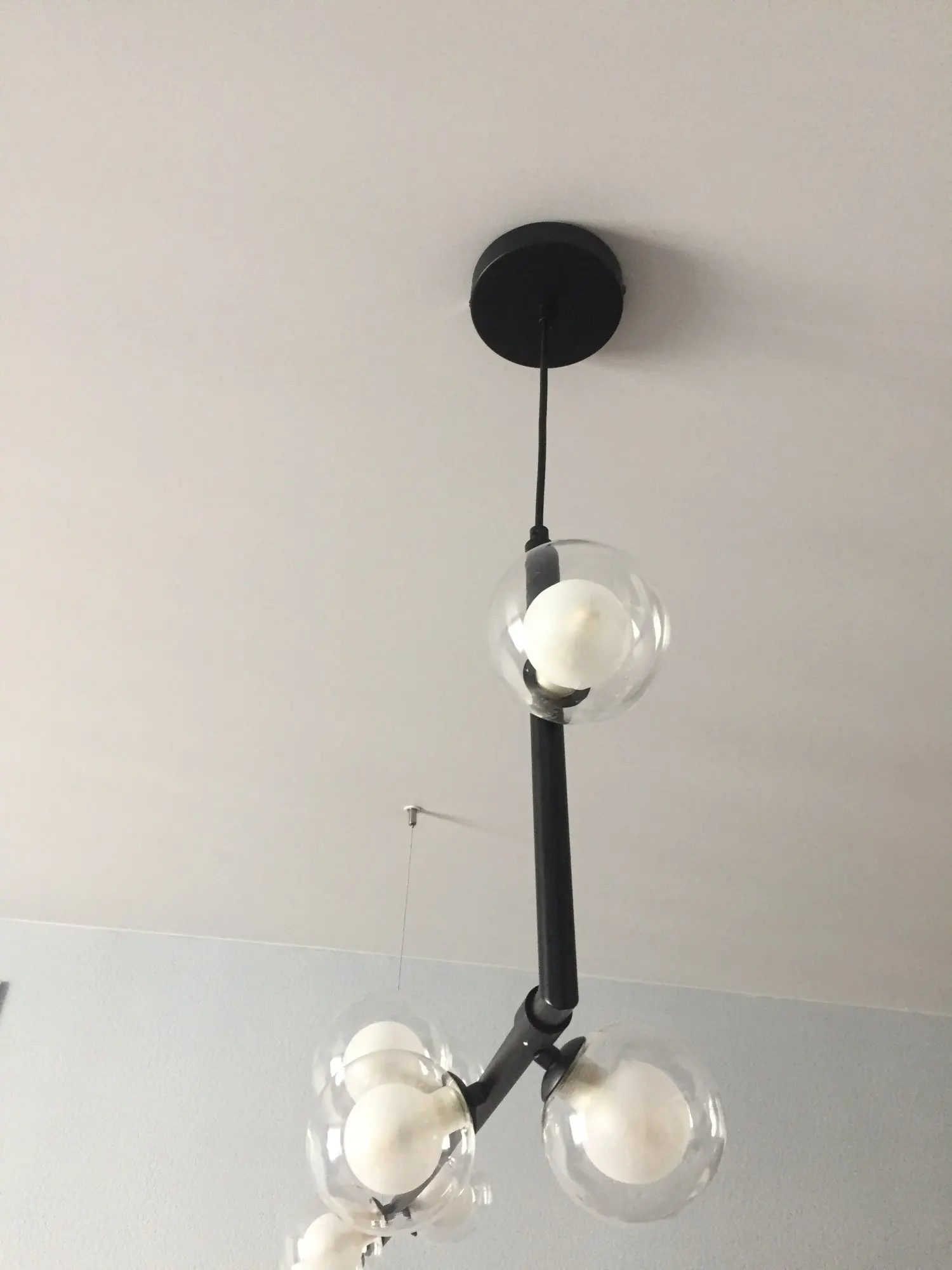 Люстра очень не обычная) вписалась с интерьер на 100%. Сама очень легкая, шарики наверно сделаны из пластика, в близки видно что на шариках есть не большое искажение в центре, типо как чуть вогнутая капелька, но это только если сильно присматриваться. Если у вас уже готов натяжной потолок с одной закладной - придётся повозиться со вторым креплением, супруг 3 часа вешал/придумывал как, тк не было второй закладной. Лампочки можно позже поменять на более яркие (надеюсь они продаются), те что пришли в наборе темноваты. В целом люстра прекрасна) курьер доставил посылку домой