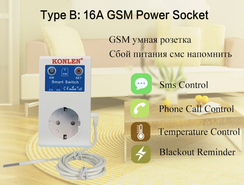 Розетка супер, все работает, симка от МТС. Был бы ещё дисплей, на который выводилась бы температура. Установил приложение для управления розеткой. По сути, это просто кнопки для отправки смс, просто теперь нет необходимости помнить команды или. Мотреть их в инструкции. Есть инструкция на русском. Использую сейчас зимой в бане, в помывочной помещение, туда же ставлю, что может замёрзнуть в лёд, там же бойлер, бак с водой. Выставил, чтобы при +7 розетка включалась, при +14 отключал ась, теперь инфракрасный обогреватель кушает электричество с паузами.