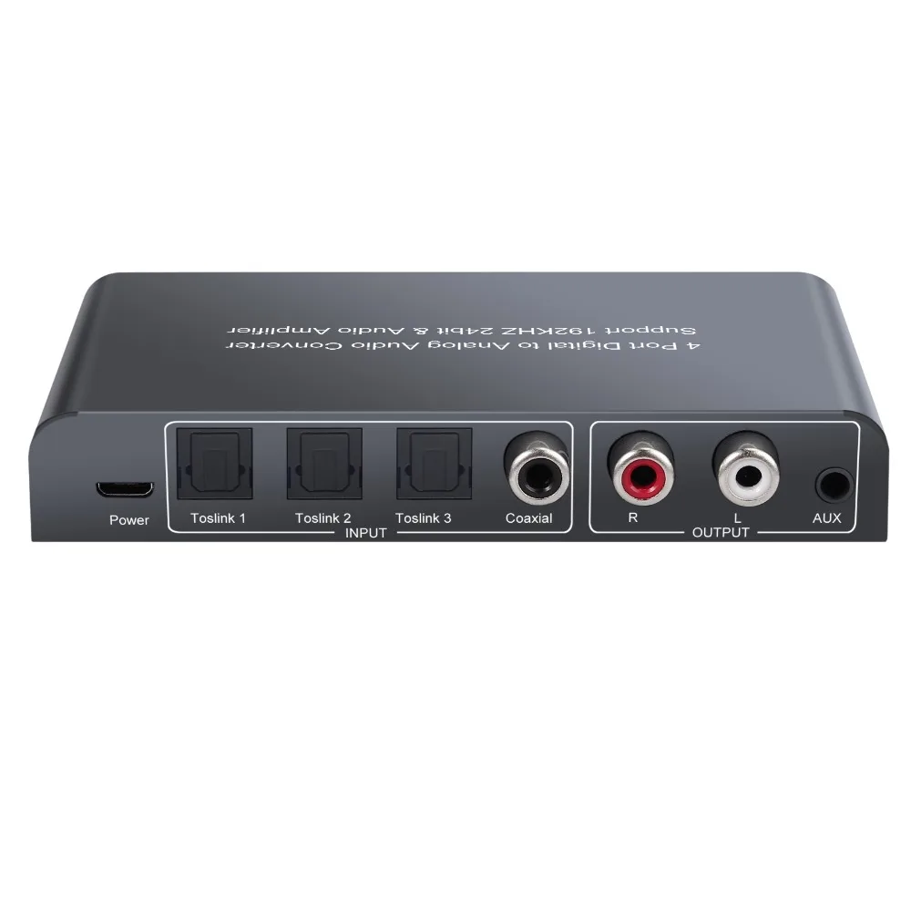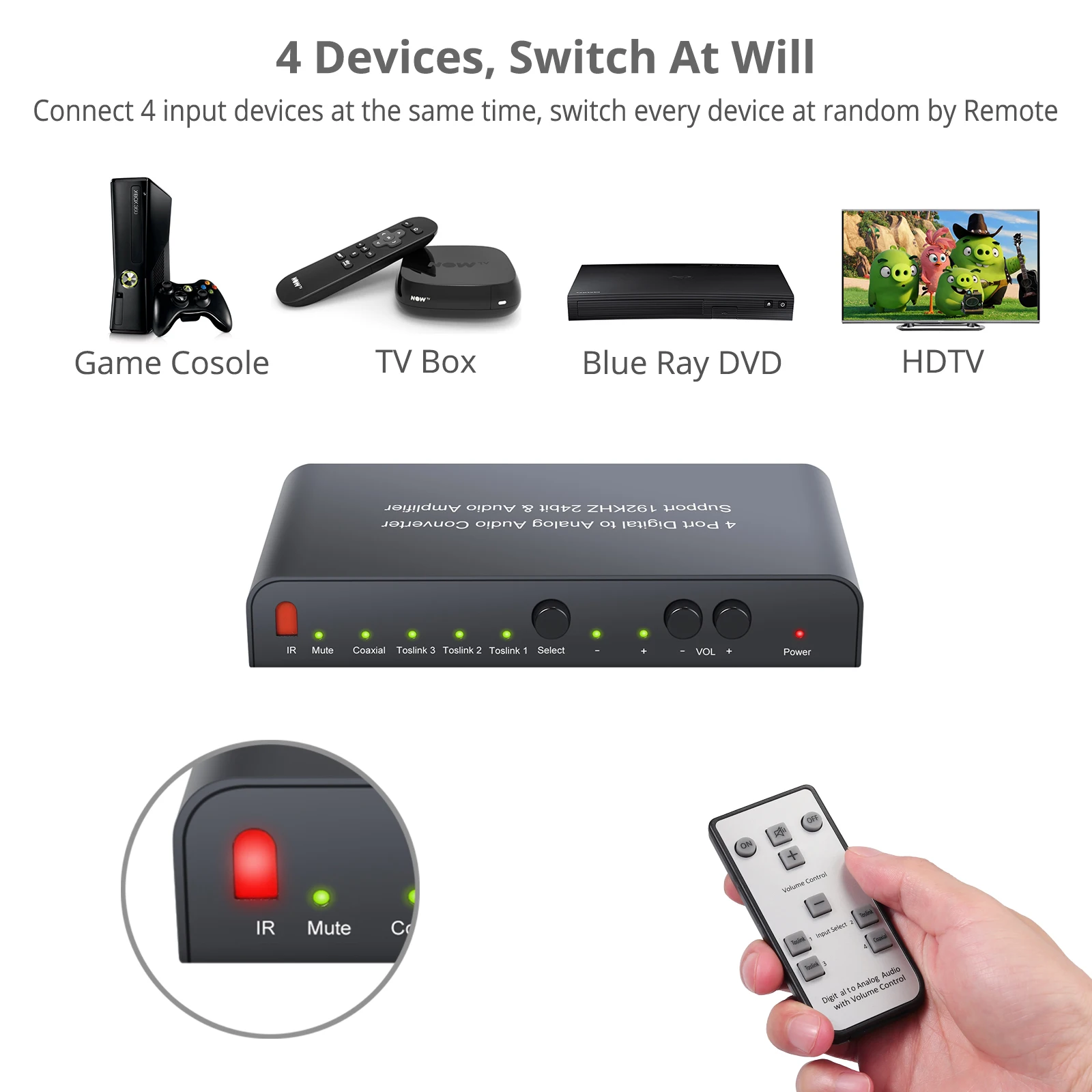 3 порта Toslink + 1 порт коаксиальный коммутатор, оптические и коаксиальные устройства могут быть синхронизированы для подключения преобразователя и могут быть выбраны в качестве входа через ИК-пульт дистанционного управления.