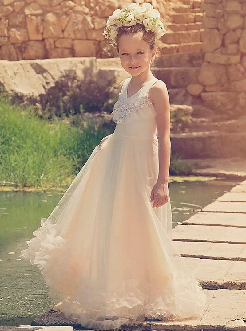 Тюлевые платья цвета шампанского с цветочным рисунком для девочек н...