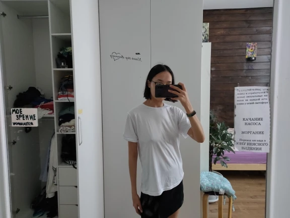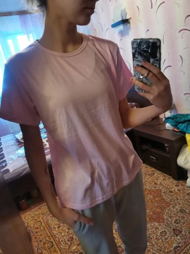 Для тех, кто не читал характеристики и купил посмотрев на фото, может быть неожиданностью, что это не хлопок или тому подобное. Это тонкая тянущаяся, ткань. Но приятная на ощупь. И из-за того, что это черный цвет и я купила размер больше- не просвечивант. Рукава будут кароче чем на фото, если купите свой размер. Но если взять на пару размеров больше, эти минусы стираются , и все будет ок. Как я. Мой размер м, футболка- хл. Товар отслеживался