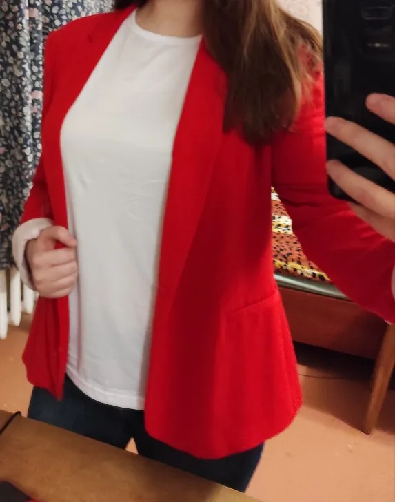 Ткань тонкая, просвечивает. Качество так себе, неприятная на ощупь ткань. Размер м как s. Короткая и рукава не широкие