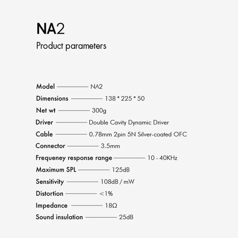 Параметры: Модель: NA2 Размер: 138*225*50 Вес нетто: 300 г Драйвер: Динамический драйвер с двойной полостью Кабель: 0,78 мм 2-контактный OFC с серебряным покрытием Разъем: 3,5 мм Частотный диапазон отклика: 10-40 кГц Максимальный SPL:125 дБ Чувствительность: 108 дБ/мВт Искажение:<1% Импеданс: 18Ω Звукоизоляция: 25 дБ Упаковка: Наушники * 1 Кабель 0,78 мм 2pin 5N * 1 Руководство пользователя * 1 Ящик для хранения * 1 Сбалансированные амбушюры (S.M.L) Басовые насадки (S.M.L) Адаптер от 6,35 до 3,5*1