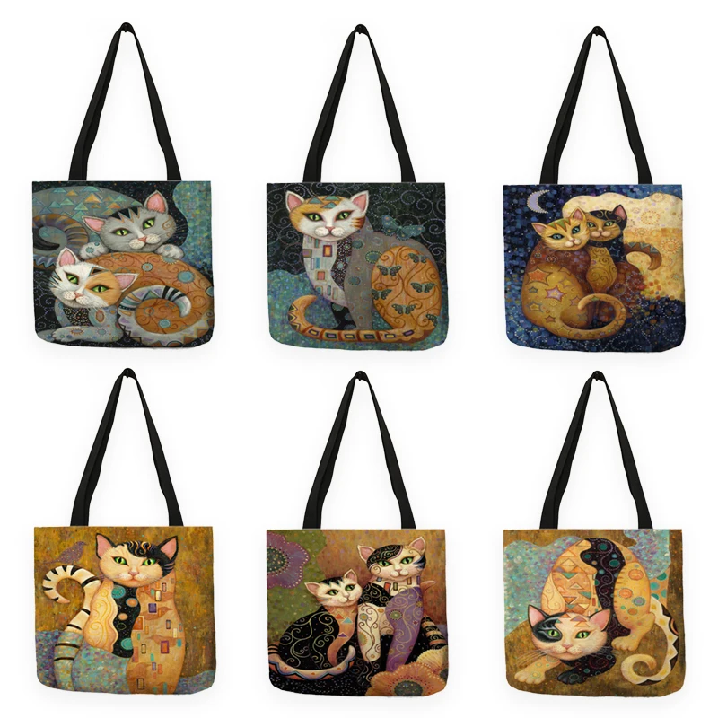 Эко-Льняная многоразовая сумка для покупок с рисунком кошки маслом,...