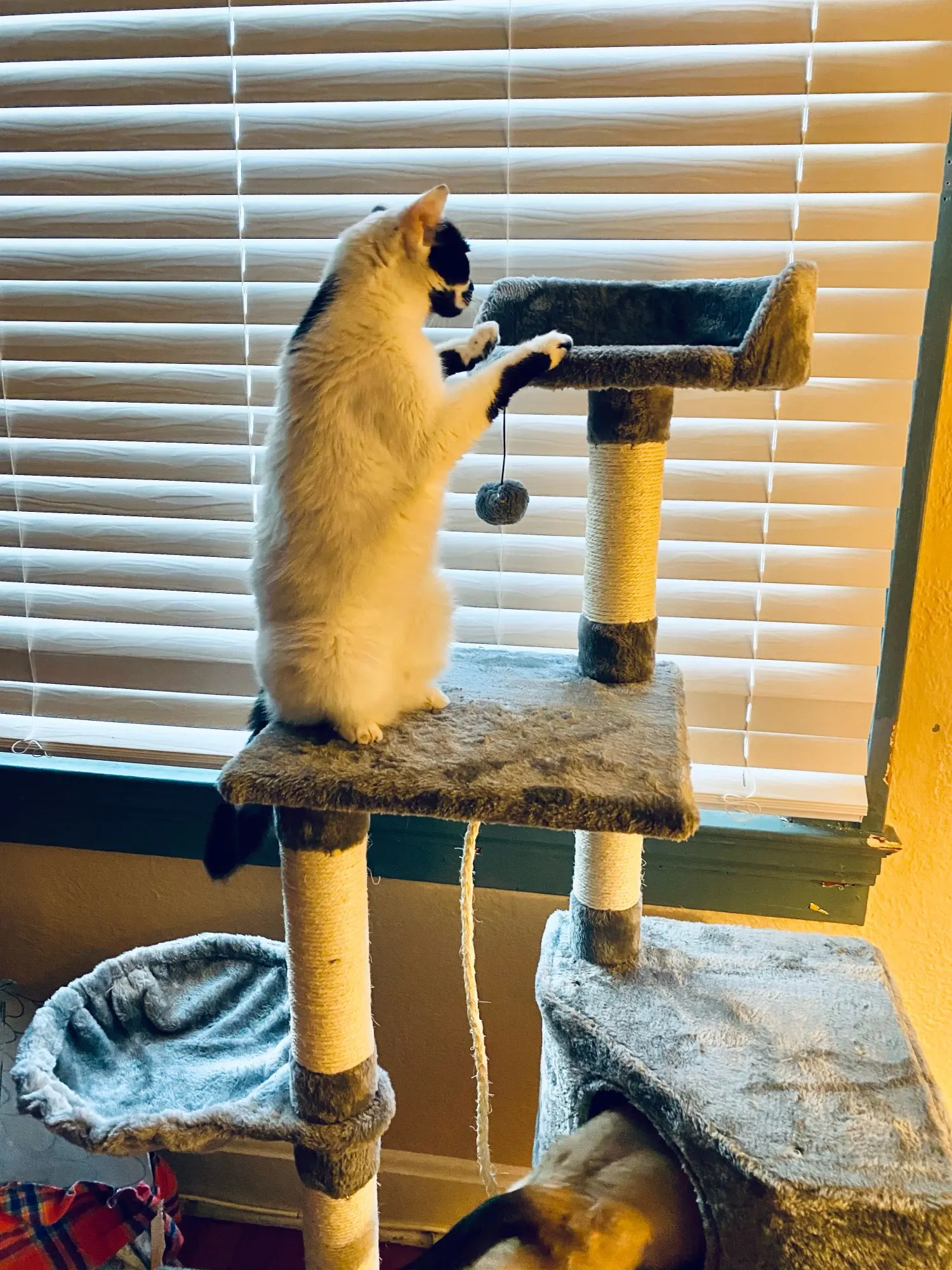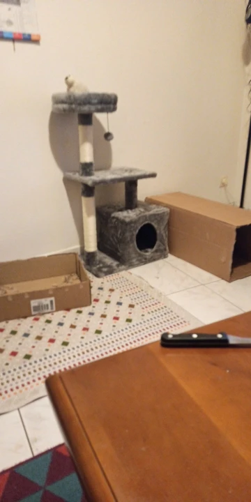 Superbe arbre à chat ! J’ai pris le plus grand (1m80). Tres facile à monter et solide (pas besoin de fixation au mur). Par contre ne l’envoyer pas avec une adresse trop longue (pas numéro d’étage / appartement) car la communication avec le vendeur est nul (4 jours à me répondre et sans me précisais si ils procéderai à l’envoie de mon colis. Donc j’ai attendus 1semaine de plus et j’ai reçu mon colis)