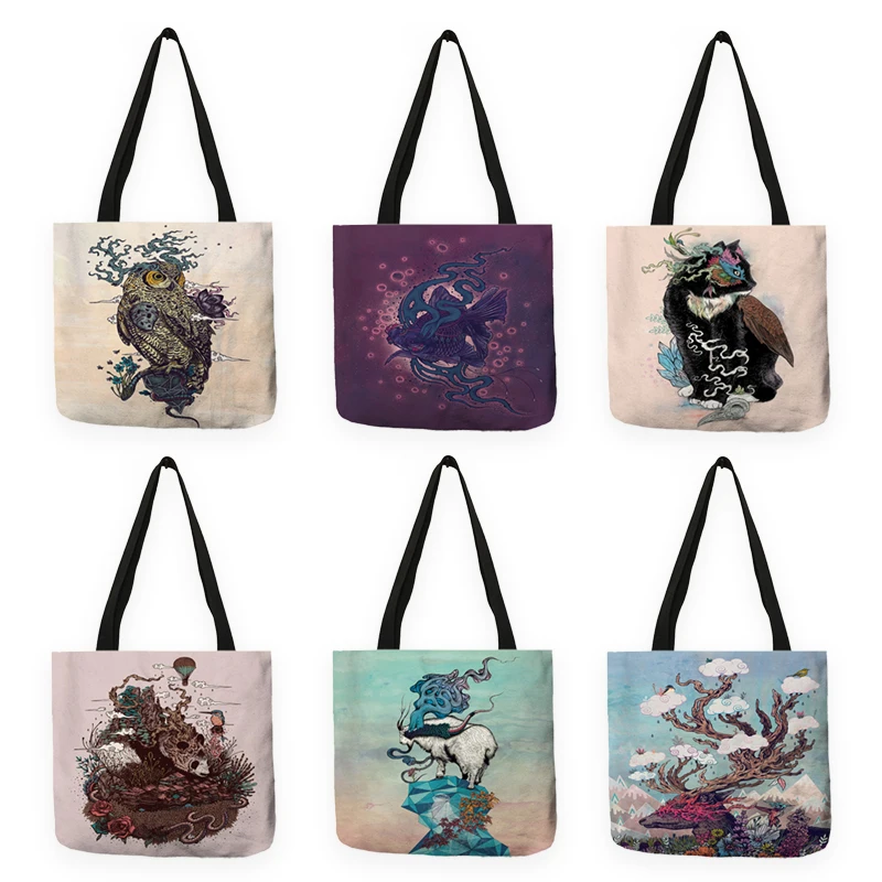 Сумка-тоут с акварельным рисунком животных, Повседневная льняная пр...