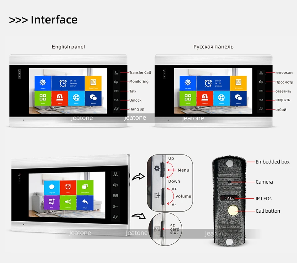 ♦7 дюймов LCD HD экран, разрешение is1024 * 600♦По индивидуальному заказу мелодии и обои♦Передача вызова на любой внутренний монитор♦Поддержка воспроизведения HD фильмов с помощью внутреннего монитора♦Поддержка голосовых сообщений♦Максимальная поддержка подключения с 2 наружными панелями вызова + аналоговые 2 камеры + 6 мониторов в одной системе♦Совместим с большинством моделей CVBS или AHD дверной Звонок♦Разблокировка двери функция♦Обнаружение движения без дополнительного устройства (контролируется программным обеспечением)♦Панель вызова и громкость монитора можно регулировать♦ИК LED обеспечивает четкое ночное видение