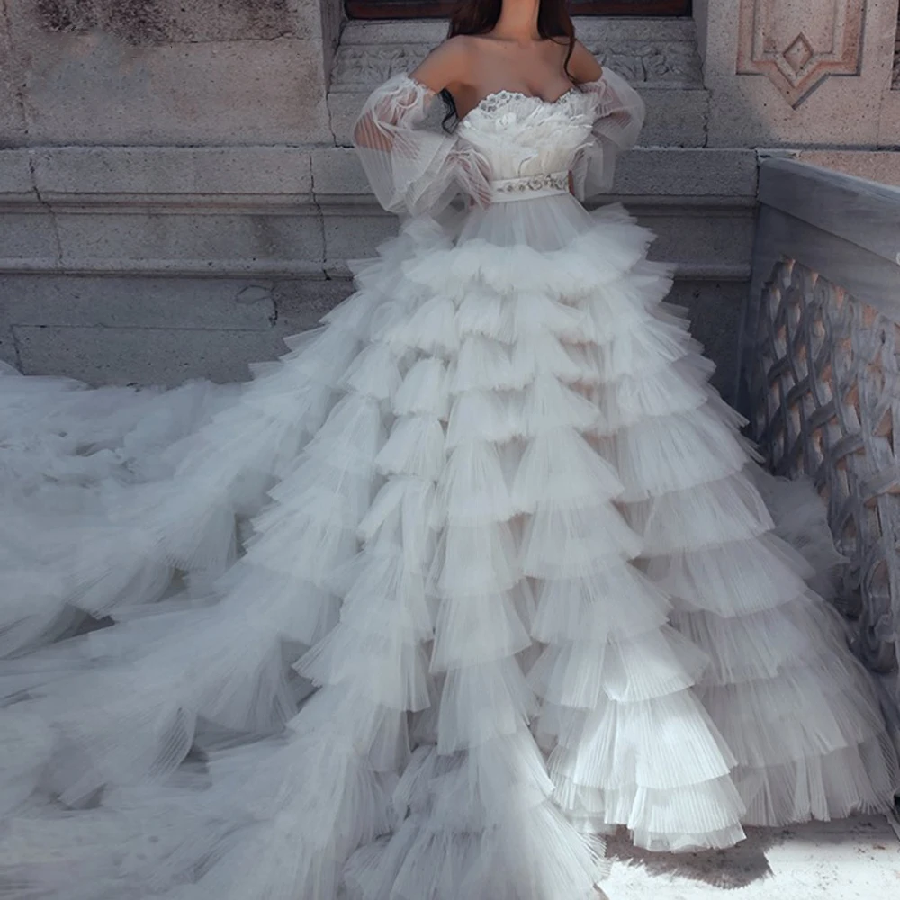 2020 Модное бальное платье, выпускные платья, Многоярусное Пышное Тюлевое платье с длинным шлейфом, официальное вечернее платье для невесты, свадебные платья со съемными рукавами