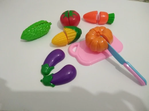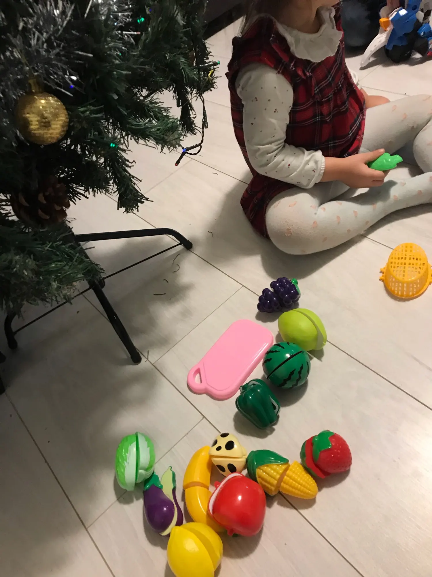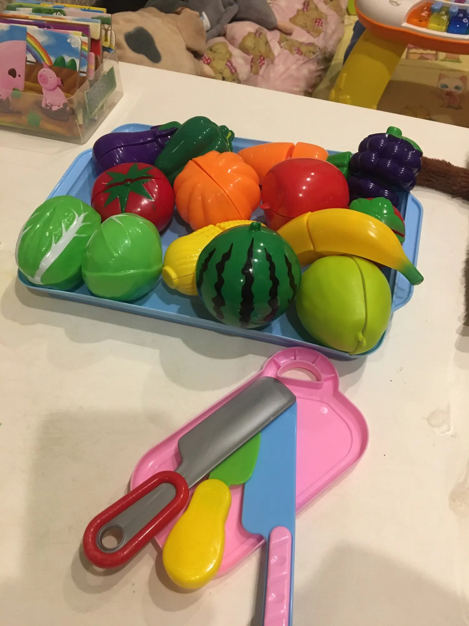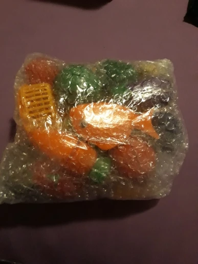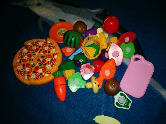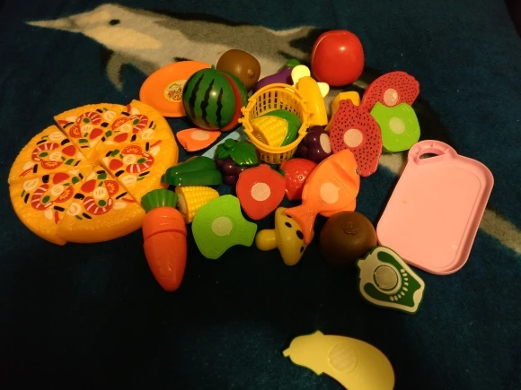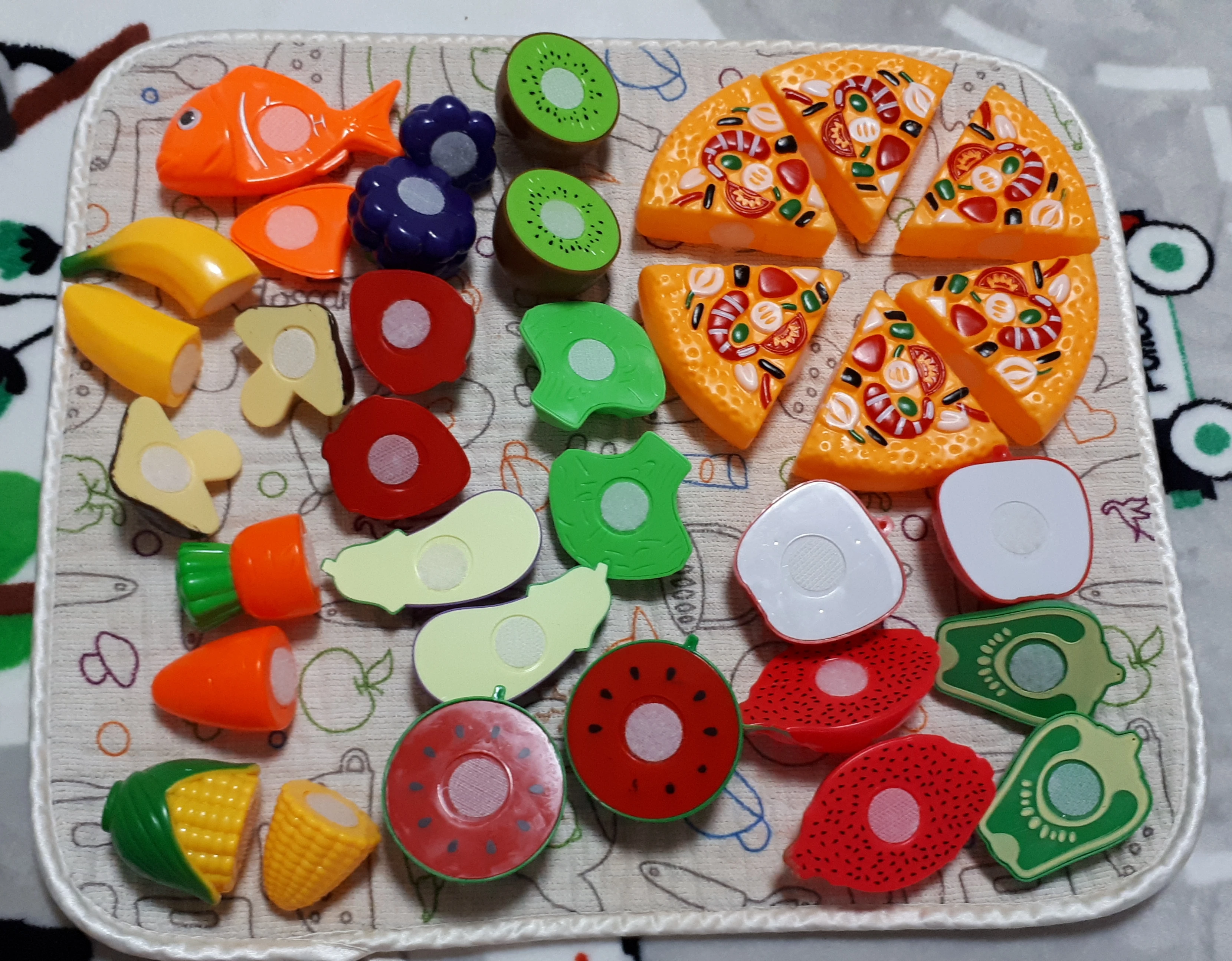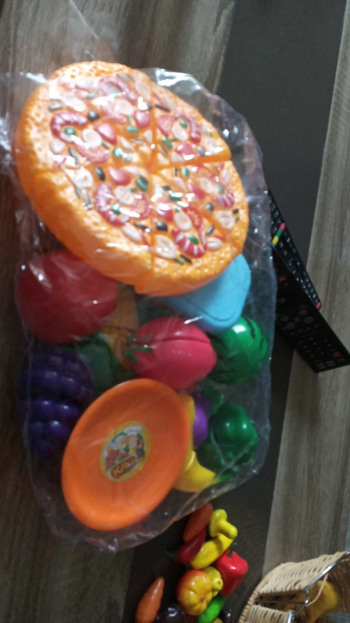 набор хороший, на некоторых фруктах пропечаталась краска от соседних овощей, у пиццы серединка подмята, для нас не критично.