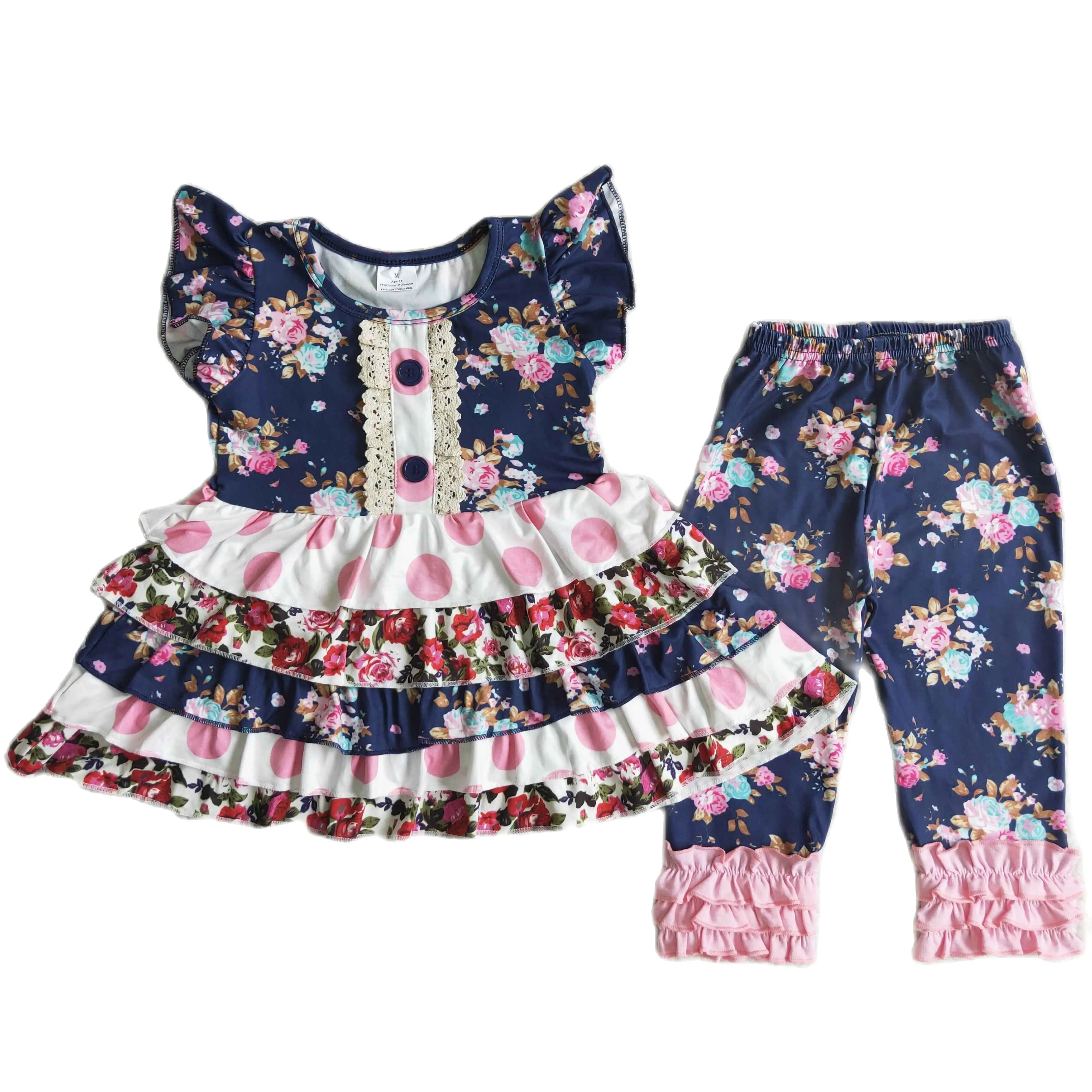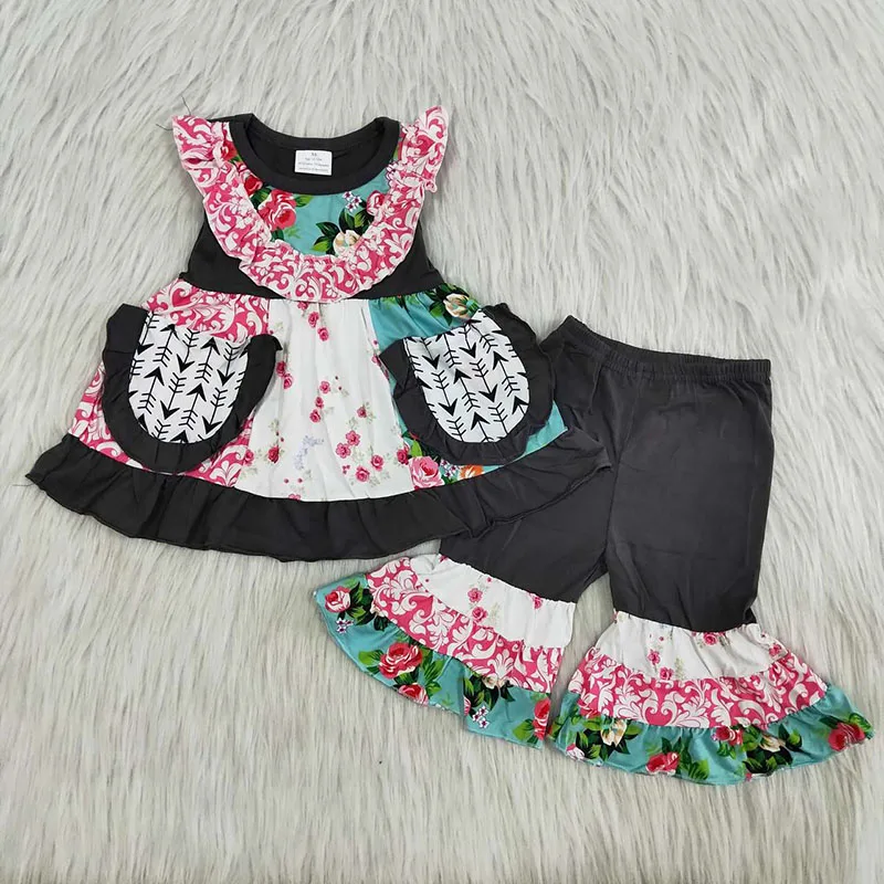 Оптовая продажа, для маленьких девочек, младенцев, детей, бутик, Цветочная туника, подходящая к цветочным брюкам, Новый Модный комплект одежды, одежда