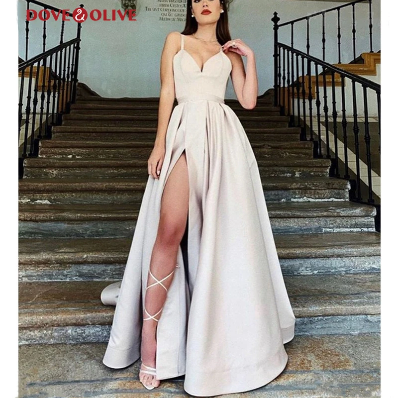Женское длинное вечернее платье, с разрезом, V-образным вырезом, на тонких бретелях, для выпускного вечера, 2020