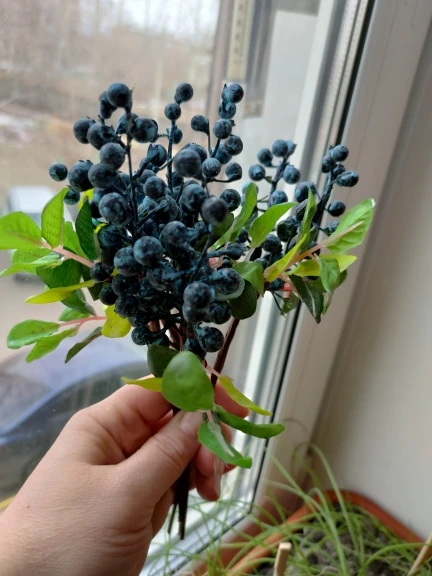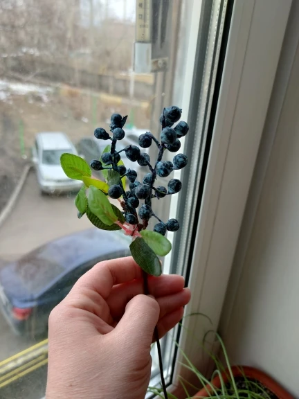 Брала синюю, чернику. Веточка немного отличается от главных фото, ориентируйтесь мини на фото при выборе цвета, поскольку на главных лишь похожие веточки, но я это осознавала ещё до покупки. Сейчас немного о своих впечатлениях: (1) в реальности веточки и сами ягодки мельче, чем кажутся и указано, поэтому на фоне крупных цветов могут плохо смотреться, длина ок. 24 см, а не 25, диаметр ягод 0,5-0,7 см, (2) не литая, а окрашенный пластик, при этом краска частично осыпалась уже при транспортировке, покупала такие же у др. продавца - ситуация аналогична - это разочаровало сильно, (3) местами есть клей на листьях, но не критично, малозаметно, (4) тонкая и хлипкая веточка, проволока тонкая и гнется хорошо, некритично, но множественные эксперименты могут навредить, (5) местами есть лишние детали на ягодах, они склеены между собой, что-то торчит. Если в пышном букете, то все в глаза не бросается (пока краска не осыпалась полностью). Спор не открывала, с продавцом не общались.