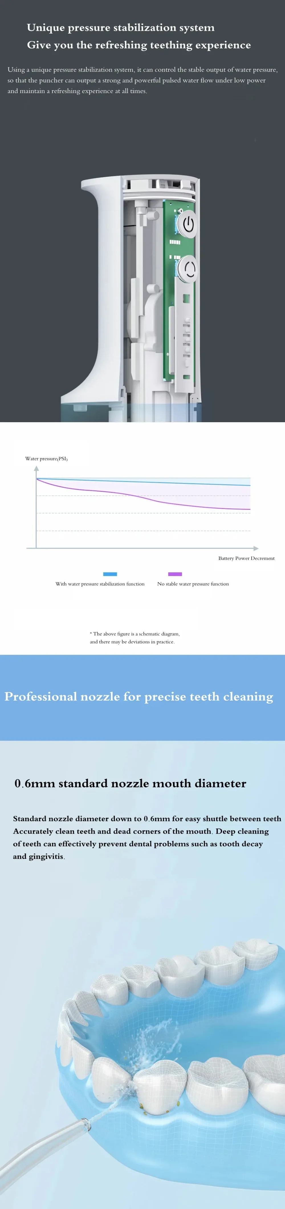 -- Smart2 минутыАвтоматическое отключение питания-- 200 млБак для воды большой емкости-- 0,6 ммСтандартный диаметр сопла. Точно очистите мертвые пространства между зубами-- 4-х скоростной режимС узоромФункция памяти, Сильный режим, стандартный режим, чувствительный режим, импульсный режим-- Оснащен новой угольной щеткой, умный двигатель с постоянным магнитом с давлением воды до140PSl,Который может генерировать высокочастотный пульсированный водяной столб1400 раз/минуту