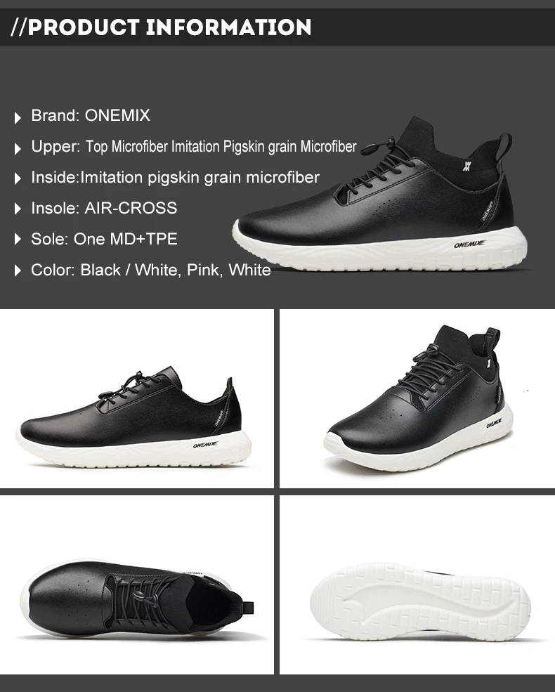 Бренд: ONEMIX Верх: верх из микрофибры с имитацией свиной кожи Внутри: имитация свиной кожи из микрофибры Стелька: воздухопроницаемая Подошва: один MD + TPE Цвет: черный/белый, розовый, белый