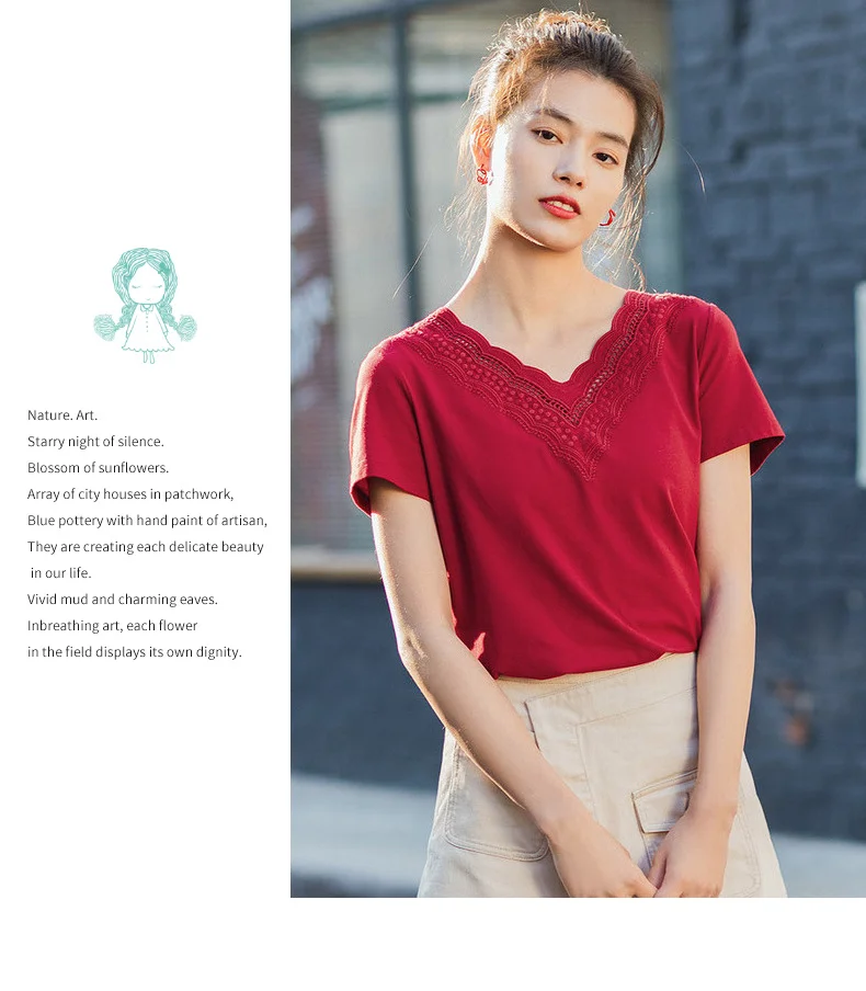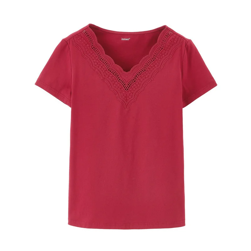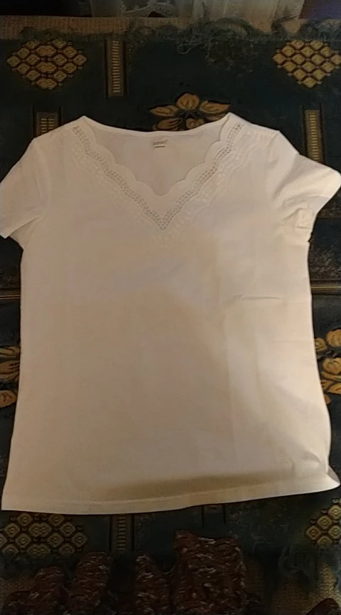 Футболка замечательная. Очень красивый темно-красный цвет, кружева на горловине и хорошее качество ткани. Немного маломерит, на 46 размер нормально XL . Сидит хорошо. Но у кого широкие плечи, большая грудь или живот, нужно брать размер побольше. На стандартных фигурах все хорошо. Однозначно рекомендую к покупке.
