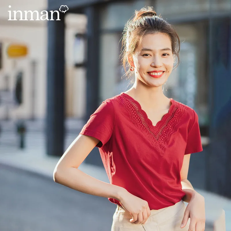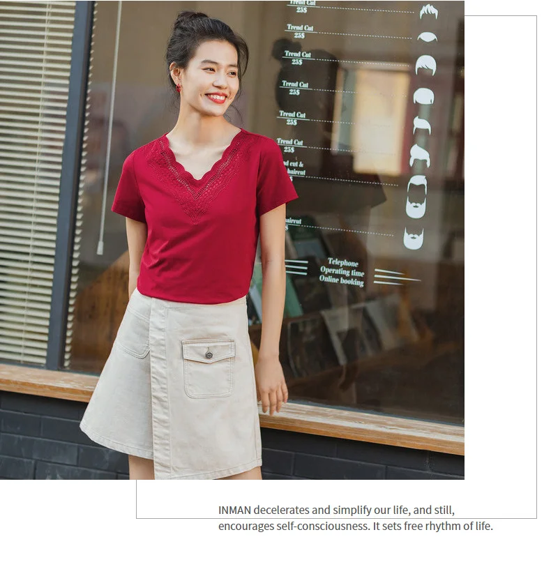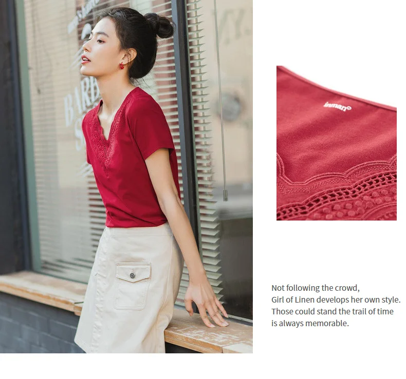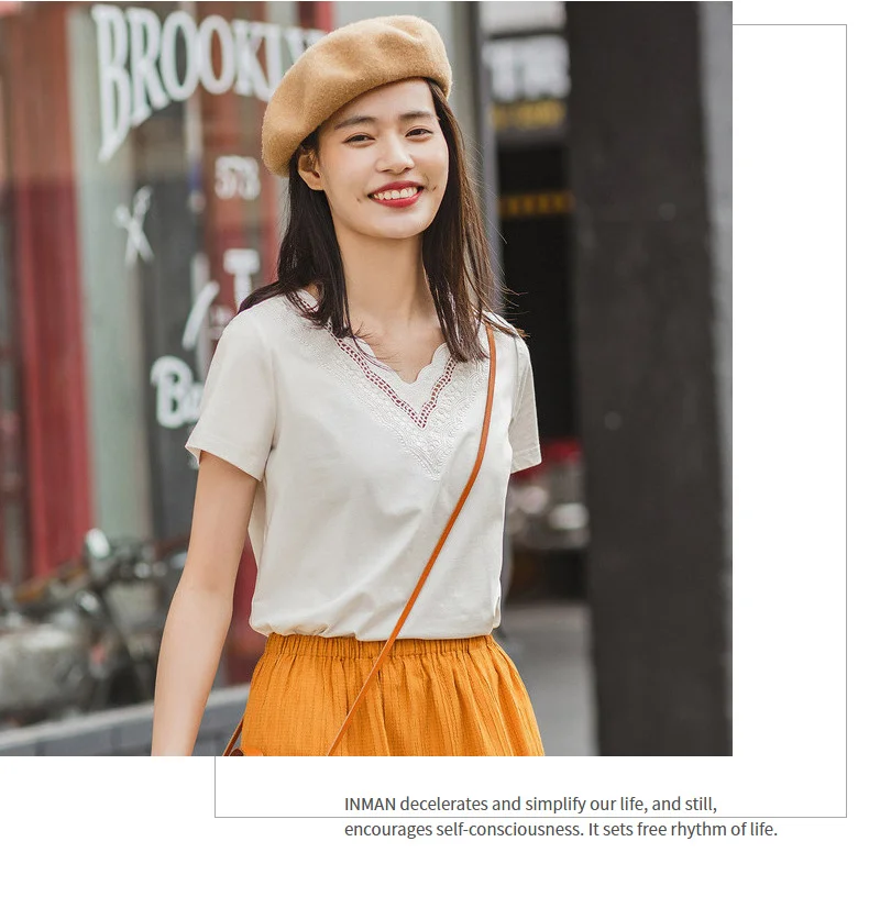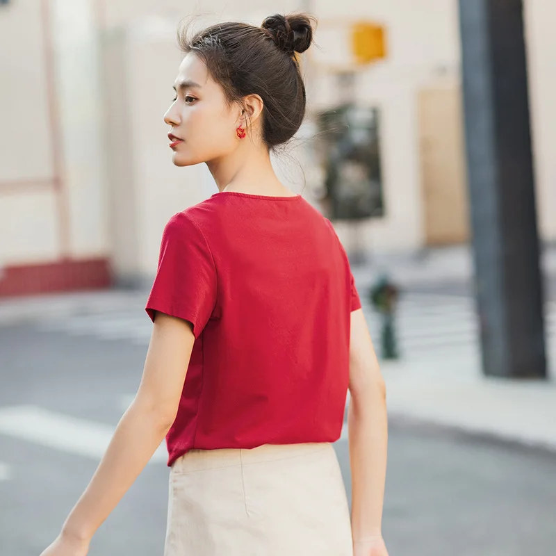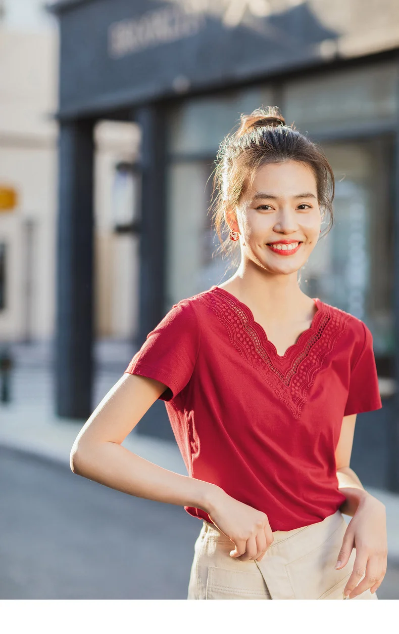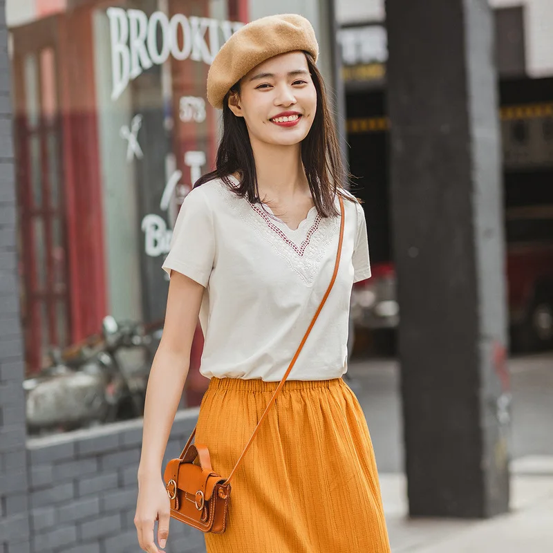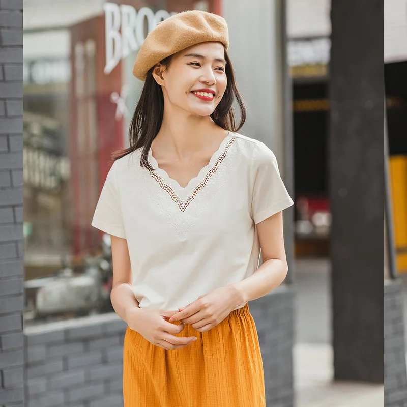 Летняя футболка с вышивкой, с V-образным вырезом и коротким рукавом