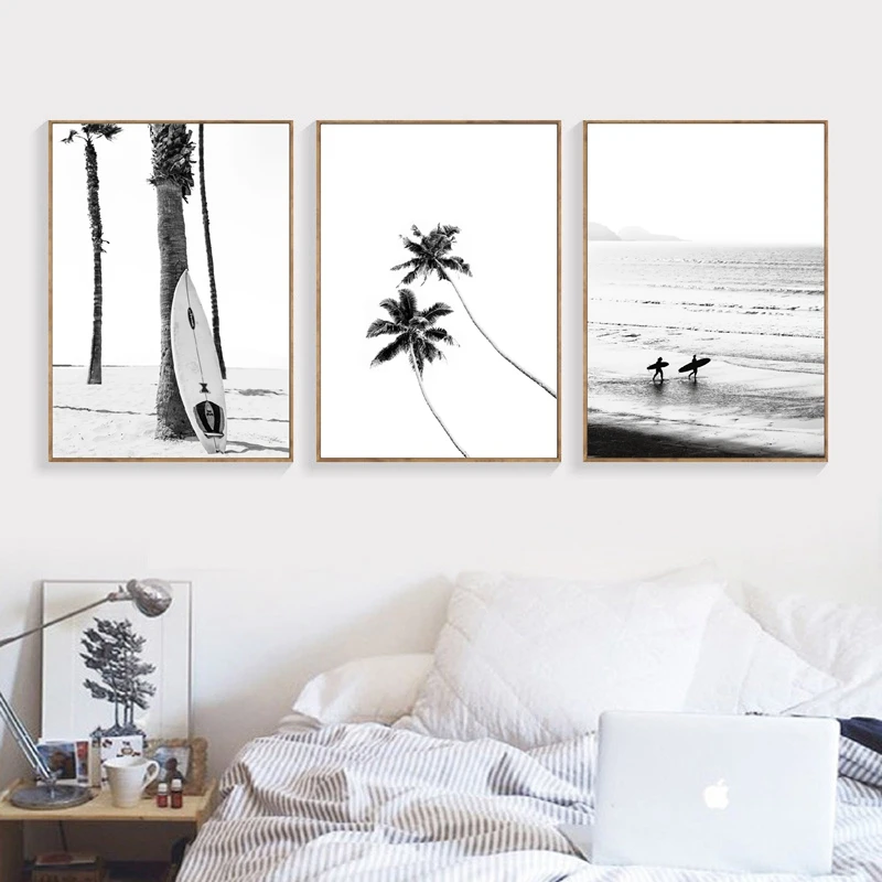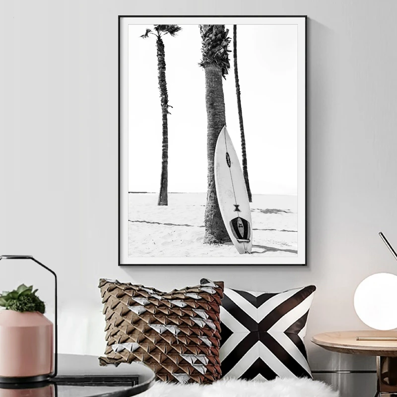 Тропический океан пляж пейзаж Ван автобус Пальма доска для серфинга Холст плакат черный белый скандинавский стиль настенные художественные картины Декоративная живопись скандинавский домашний декор