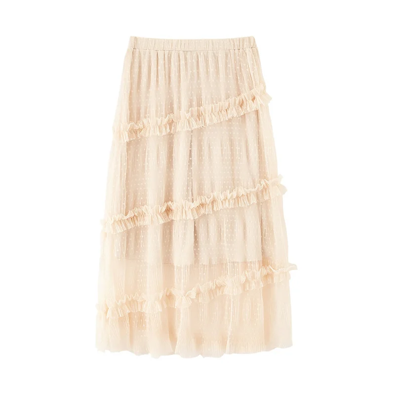 Юбка трапециевидная Женская средней длины, элегантная юбка-трапеция с оборками, бежево-белая, в литературном стиле, INMAN, лето
