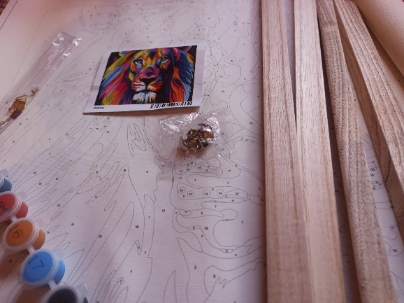 Льняной холст; 3 кисточки; 1 набор акриловых красок; Инструкция; Справочный лист; Рамка; Вешалка; Винты