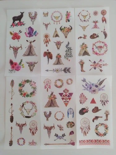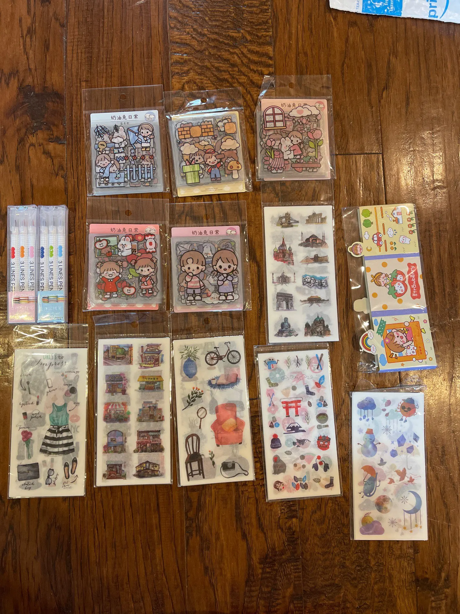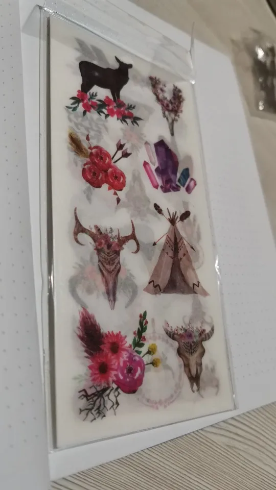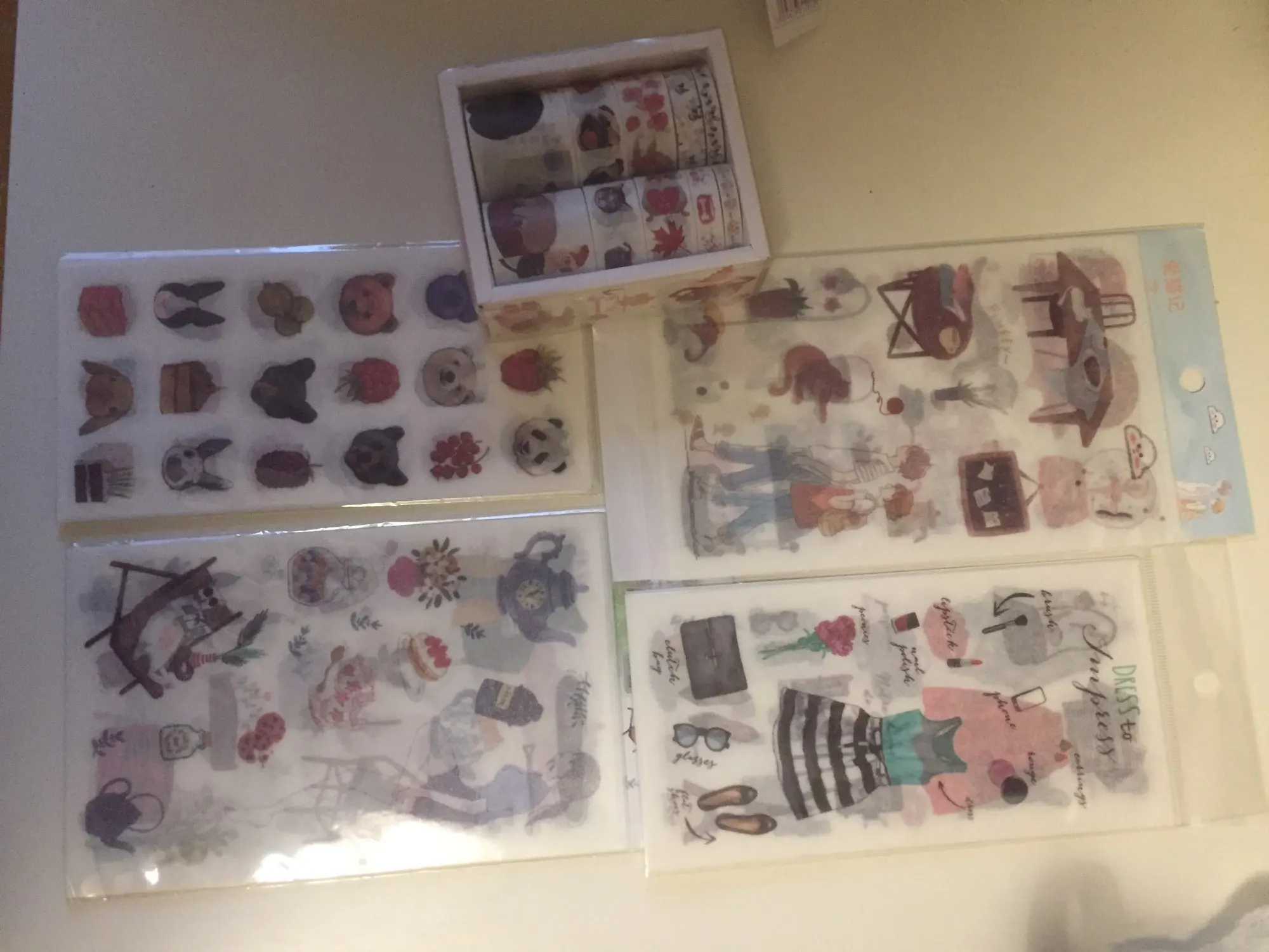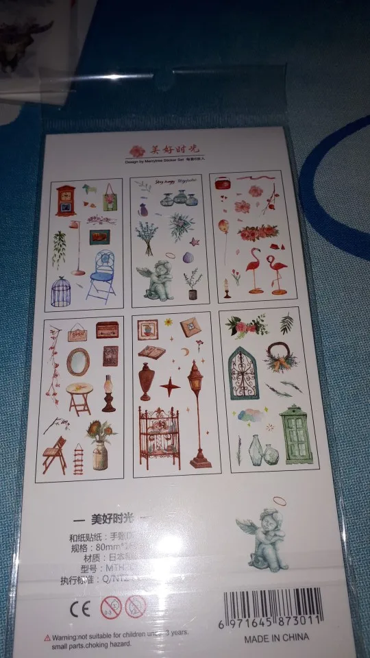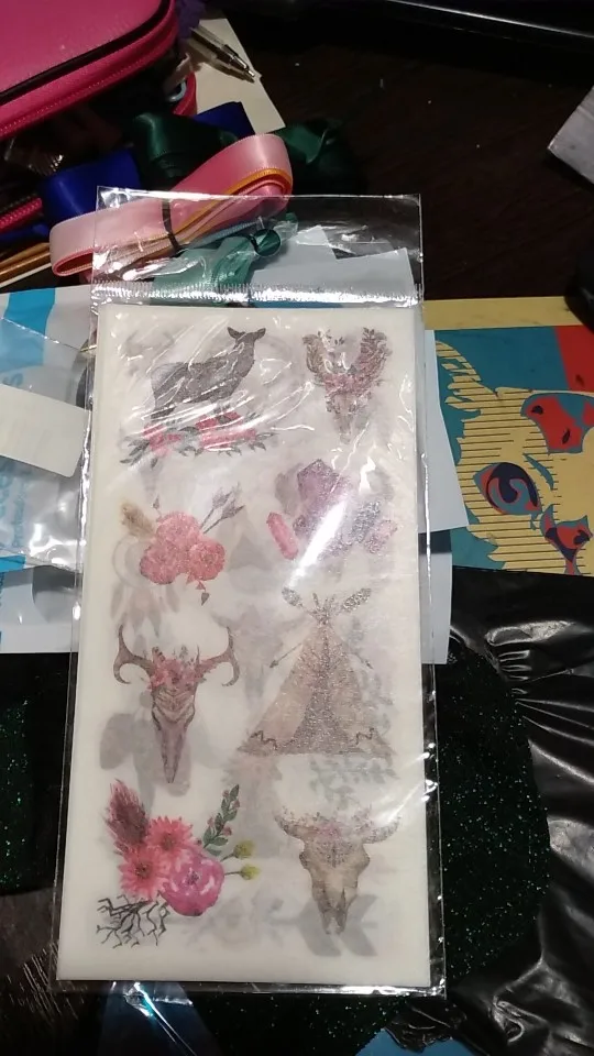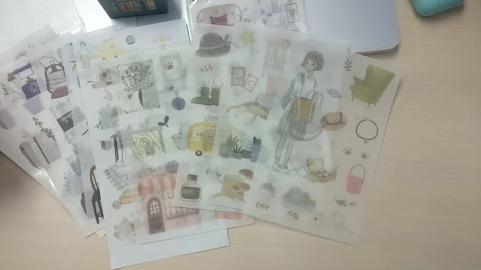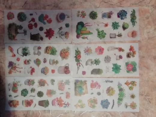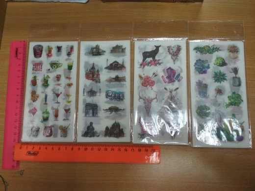 Заказ шёл два месяца. Упакован в обычный пакет. В каждом наборе по 6 листов стикеров 16×8 см. Листы полупрозрачные, на белом фоне стикеры в принципе смотрятся хорошо, достаточно ярко. На цветном хуже (клеила на чехол фиолетовый - выглядят как потертая старая бумажка, рисунок почти не виден). Для ежедневников, дневников и тетрадок - хорошо.