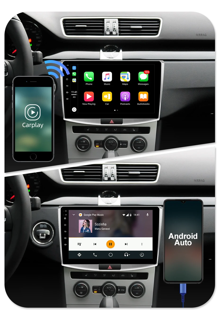 Встроенный беспроводной Carplay и проводной Android Auto.Легко управлять мобильным телефоном и управлять им через устройство, поддерживает больше приложений на мобильном телефоне: онлайн-карта, телефон, сообщения, музыка ...