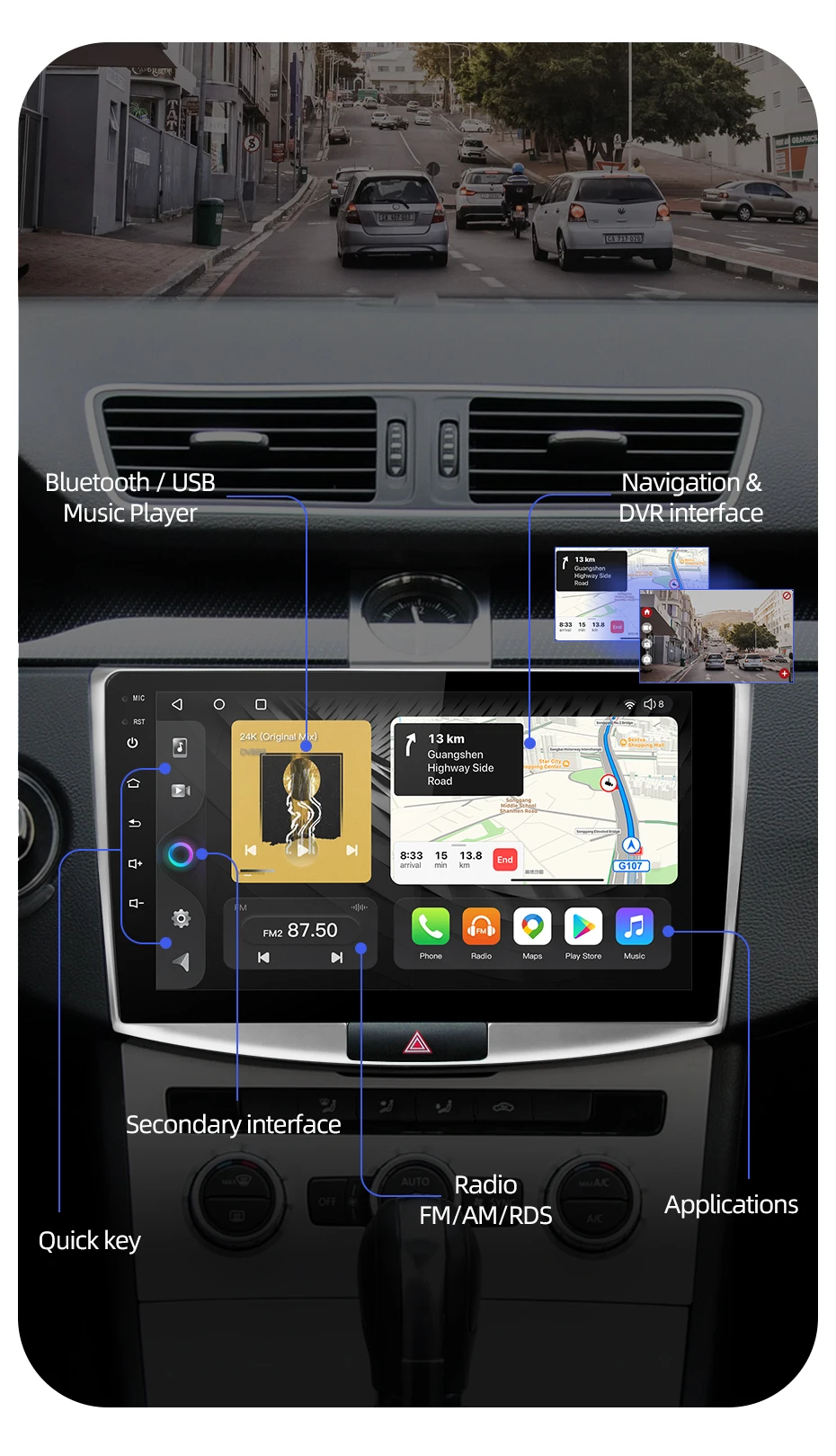 С микросхемой усилителя ST7851, встроенной звуковой системой DSP, поддерживает воспроизведение звука высокого качества. Принесите вам звуковой праздник во время вождения.Bluit-in сеть 4G и Wi-Fi, поддерживает загрузку приложений из Play Store, например: YouTube, Spotify, Whataspp ..... Избавьтесь от скуки за рулем, принесите новые впечатления от вождения.