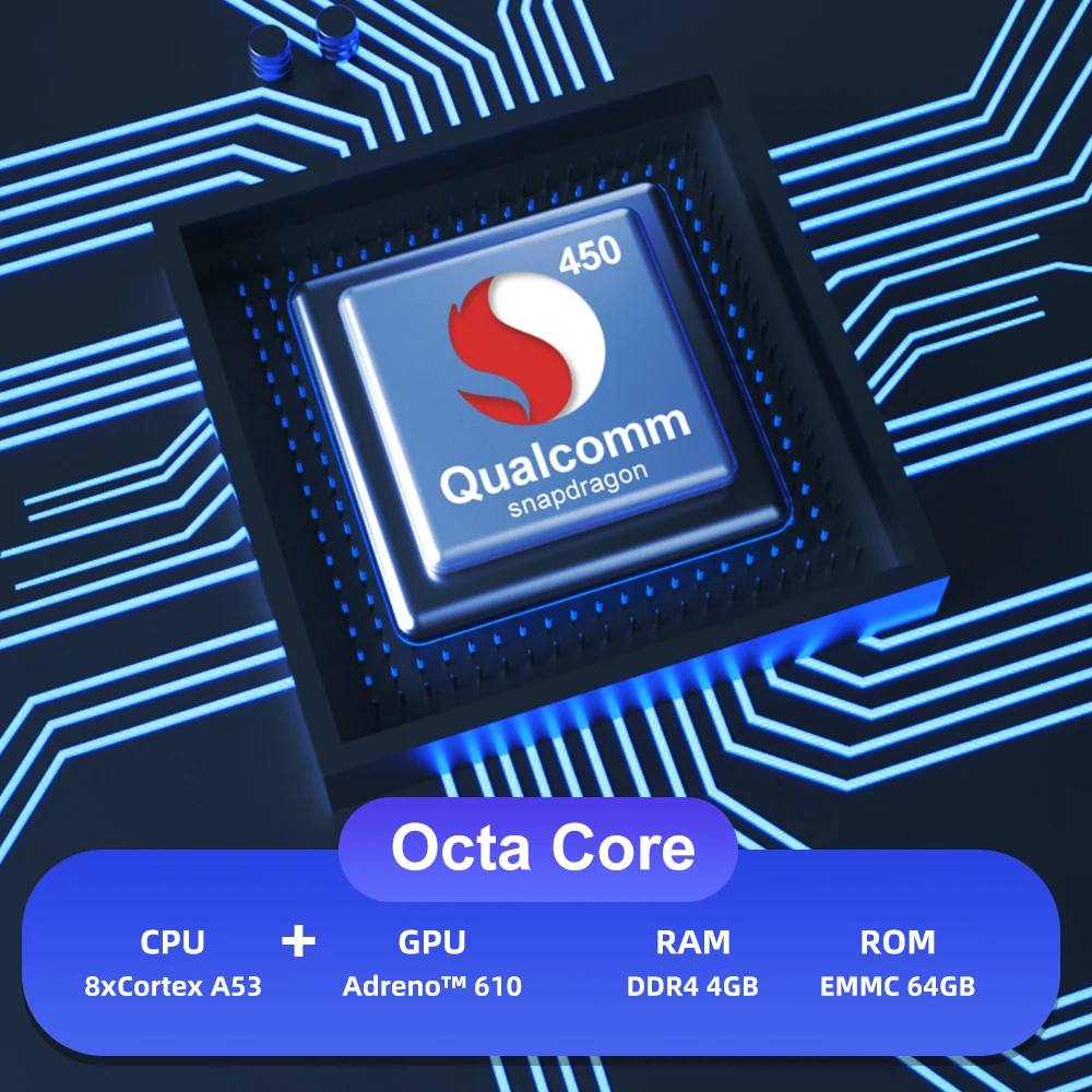 Qualcomm Snapdragon 450, Octa Core, DDR4 4 ГБ, EMMC 64 ГБ;С 8 * Cortex-A53, графическим процессором Adreno ™ 610, графическим процессором до 1,8 ГГц;Используя производственный процесс 14 нм, низкое энергопотребление, высокую производительность, бесперебойную работу.