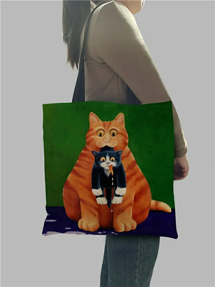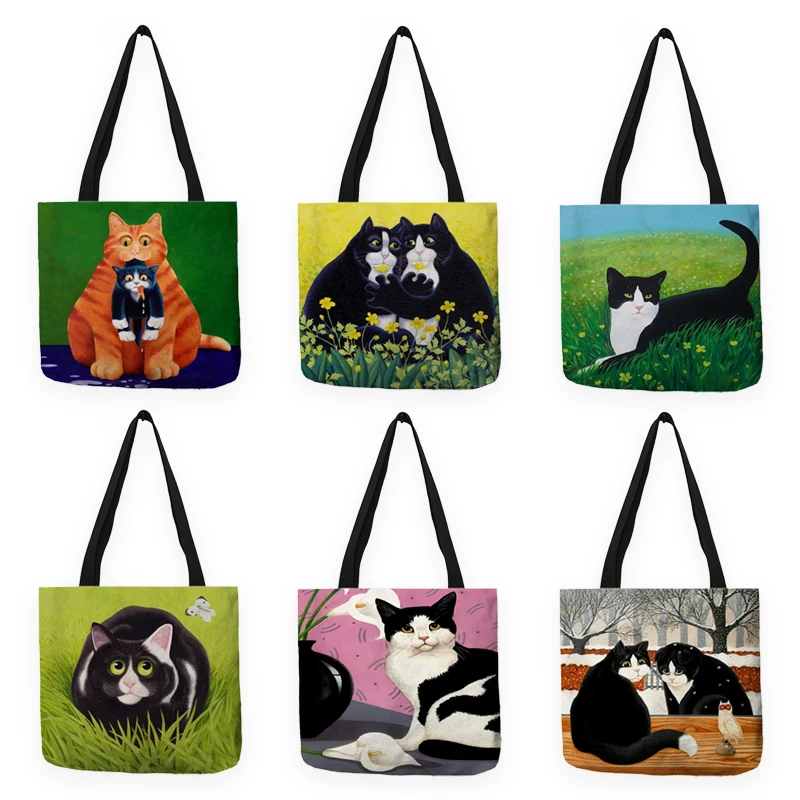 Сумка-тоут женская, из льна, с принтом в виде кошки