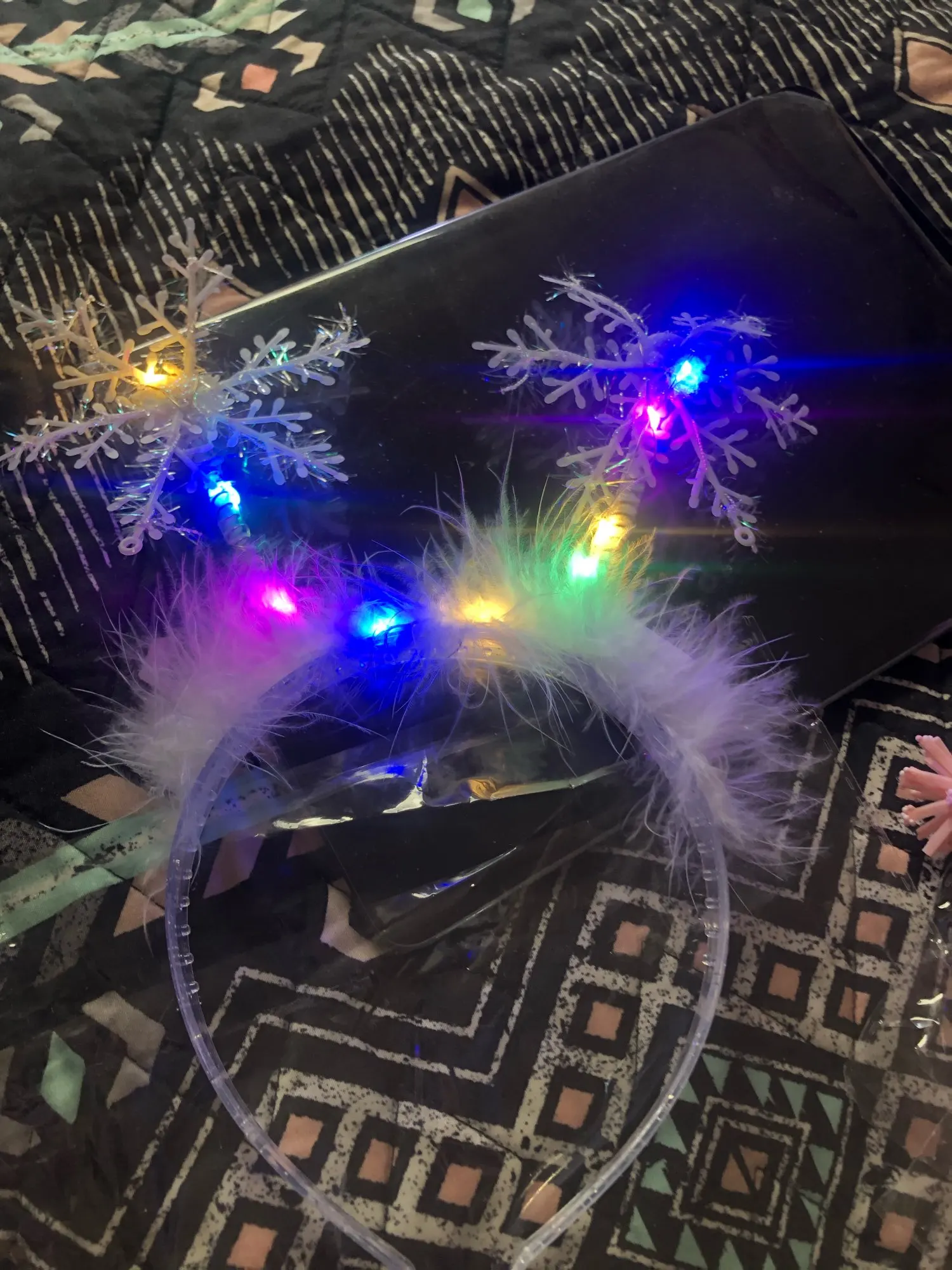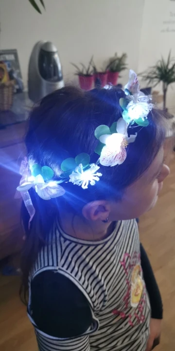 Покупал для дочки 5-ти лет. Подошло отлично. Смотрится симпатично. Резинка хорошо растягивается, так-что с размером проблем не возникло. Светодиоды светится в одном режиме постоянного свечения, мигающих режимов нет. Бабочки на булавках, то-есть снимаются. Приехало очень быстро - до Москвы за 10 дней. Я не ожидал что успеет до праздников.