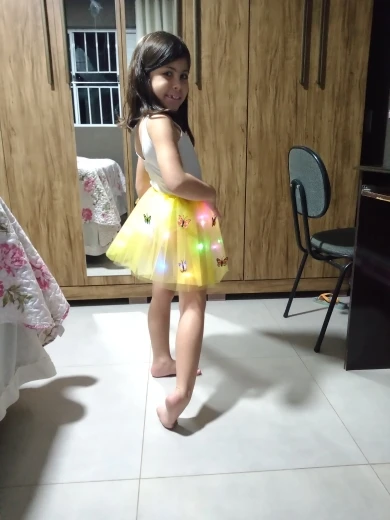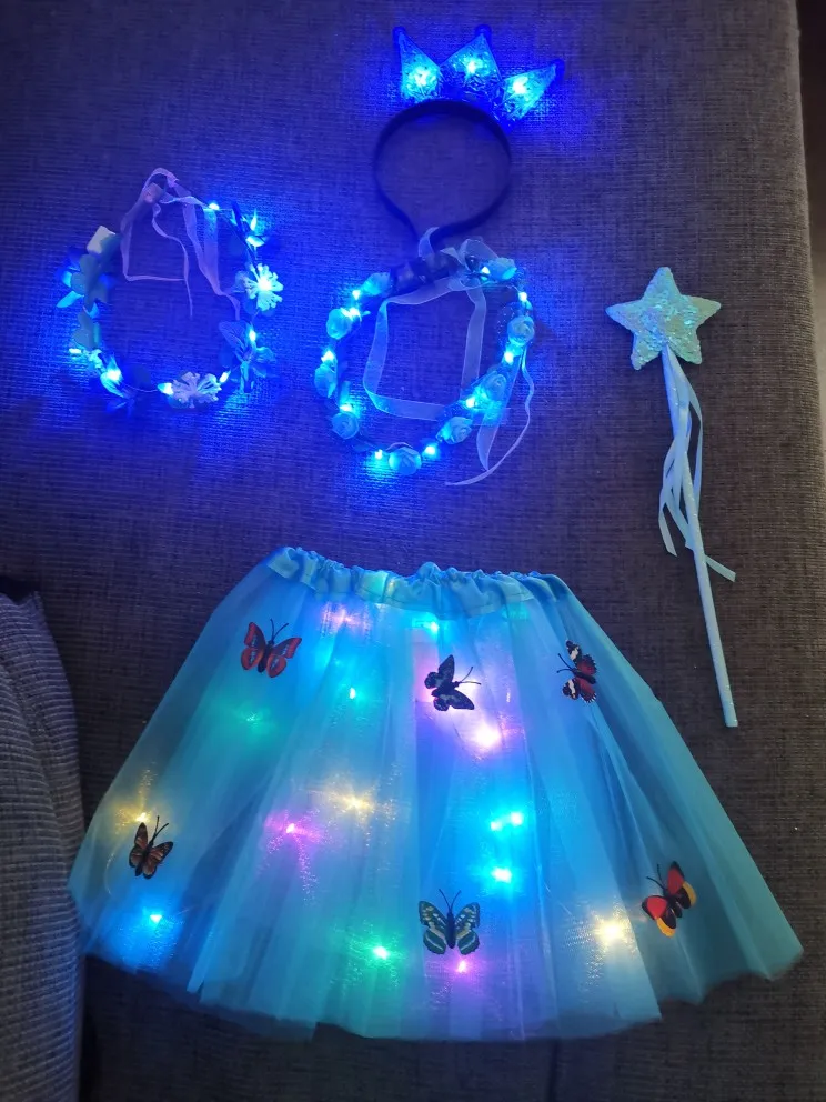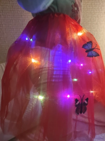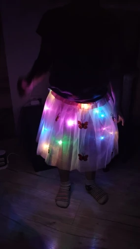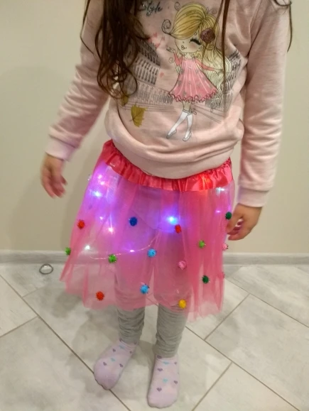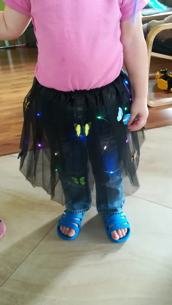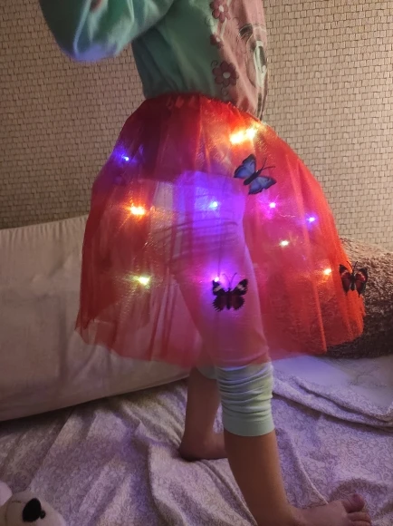 Юбка замечательная, полностью соответствует фото и описанию. Пояс на юбке растягивается, маленькие диодики светят очень приятно и ярко. Бабочки пристегнуты на булавки. Надеюсь, что юбка понравится 5-летней девочке! Буду заказывать еще в подарок!