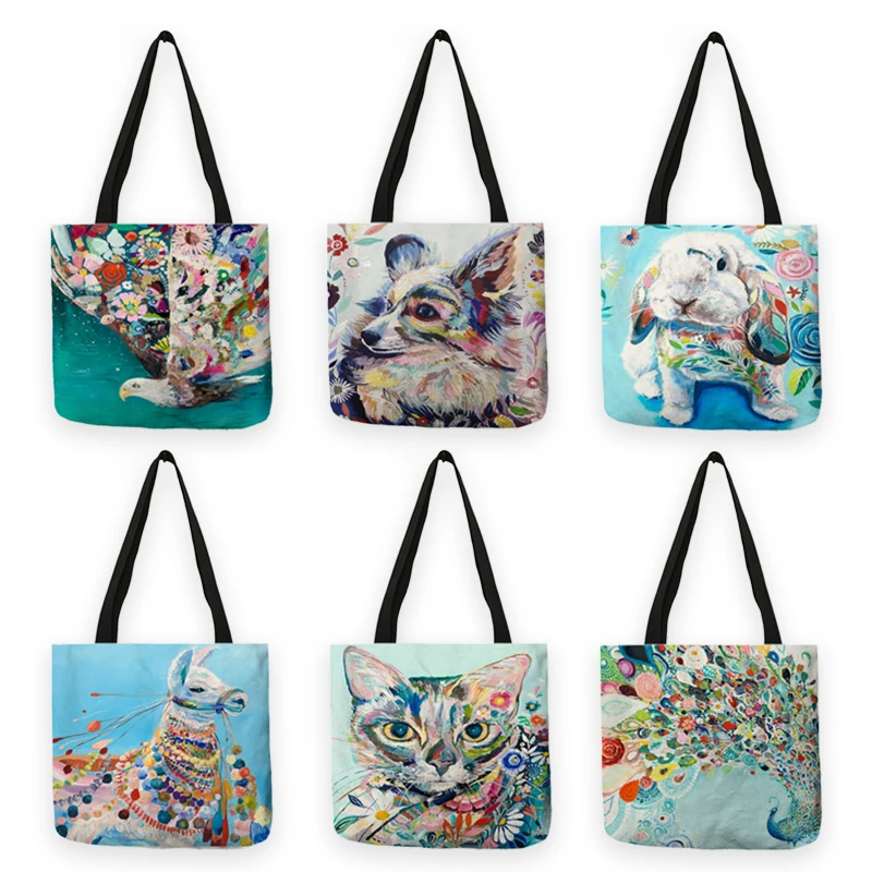 Льняная сумка-тоут с рисунком животных, многоразовые модные дамские...