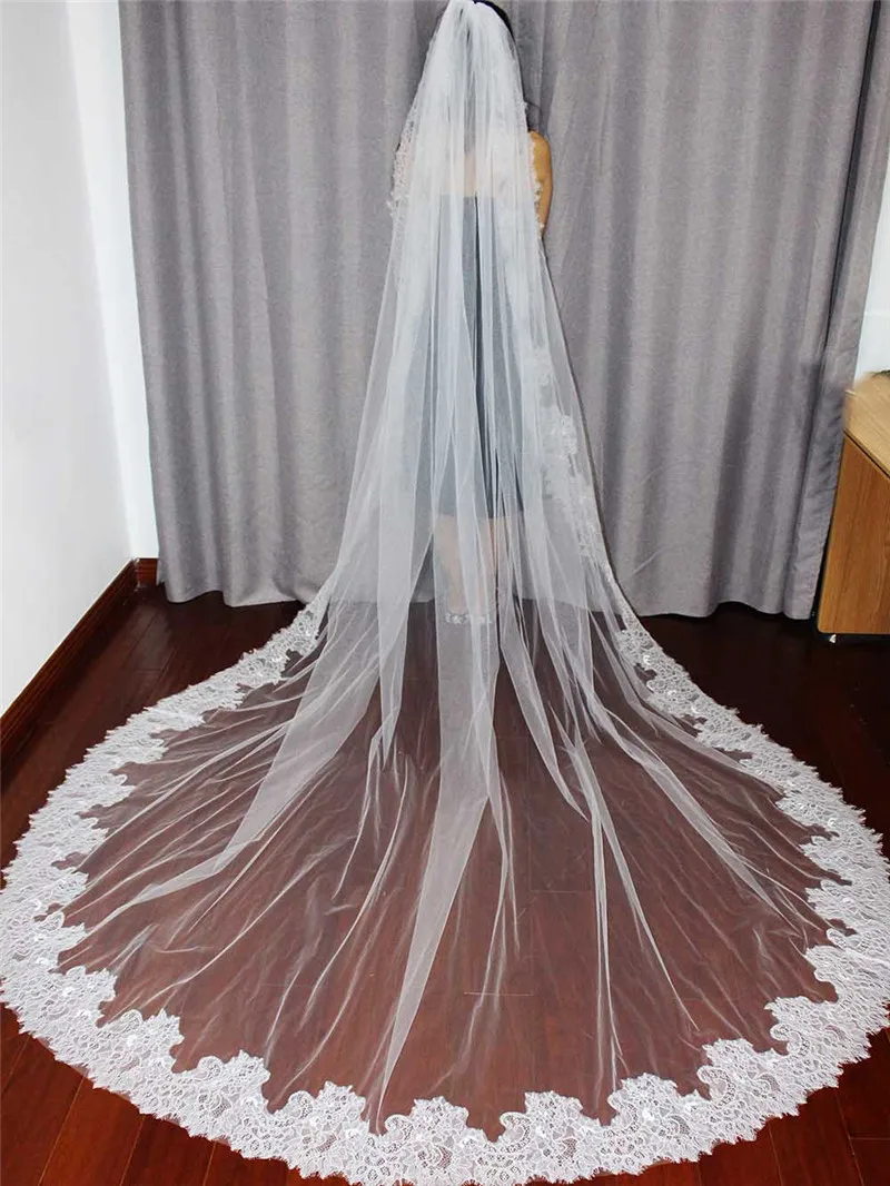 Элегантная Длинная свадебная фата с кружевом с ресницами, Высококачественная мягкая Фата невесты для собора с свадебной фатой, 3 метра, фата цвета слоновой кости