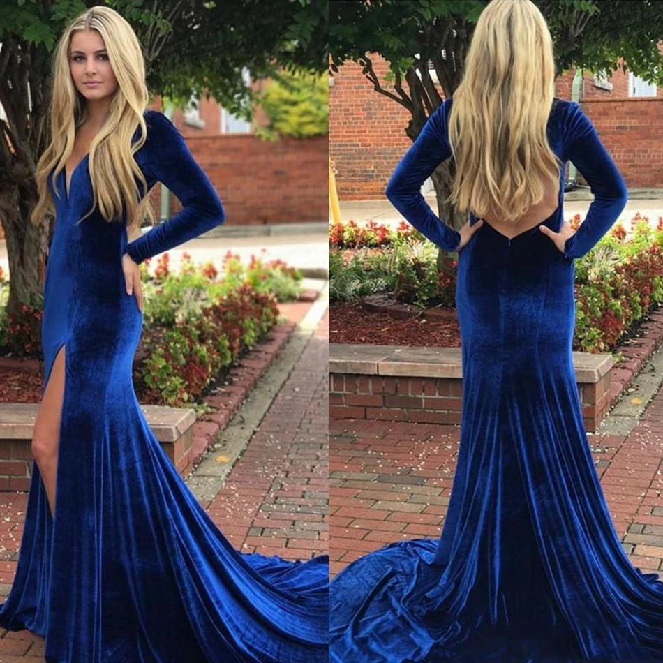 Велюровые вечерние платья с длинным рукавом и v-образным вырезом, с открытой спиной, королевский синий бархат, Длинные вечерние платья для выпускного вечера с разрезом