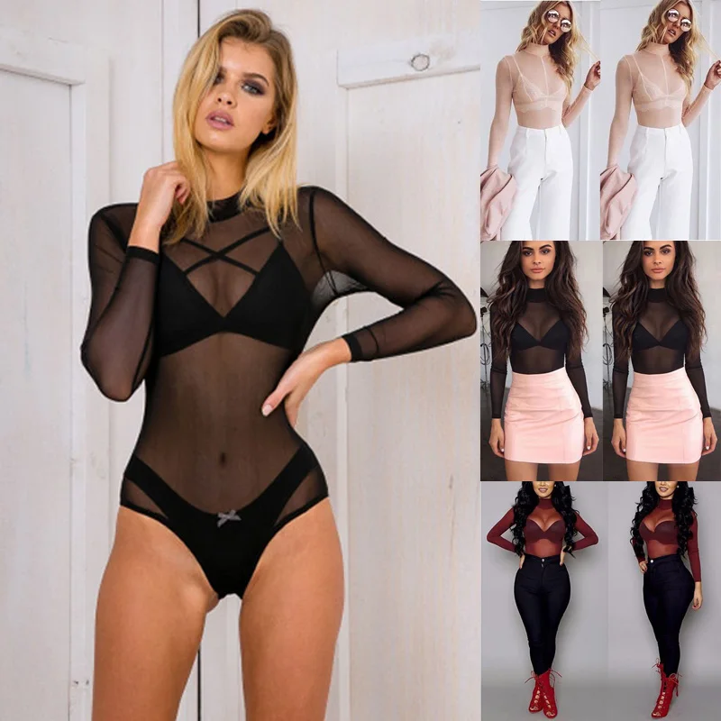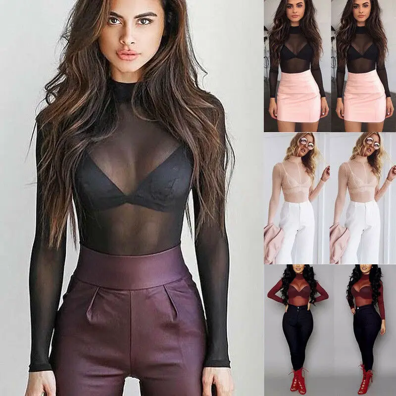 Модная женская прозрачная Сетчатая футболка с длинным рукавом, прозрачная Сетчатая футболка с длинным рукавом, сетчатый облегающий боди с высоким воротником, трико, Топ