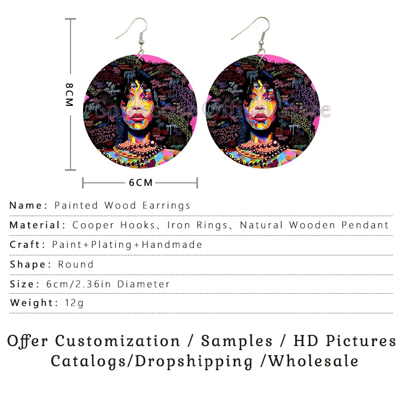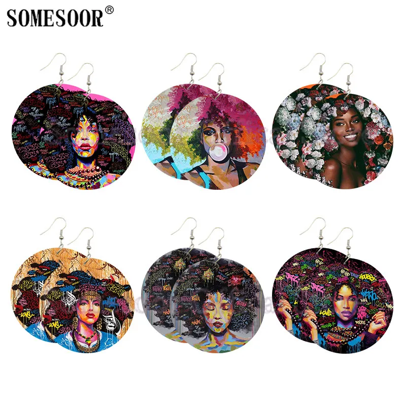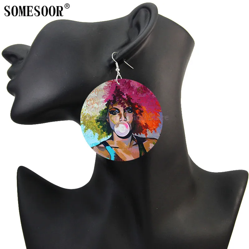 SOMESOOR африканские стильные натуральные волосы головные уборы деревянные висячие серьги черная женщина Искусство пузырьковая жвачка Граффити Печатные Деревянные ювелирные изделия