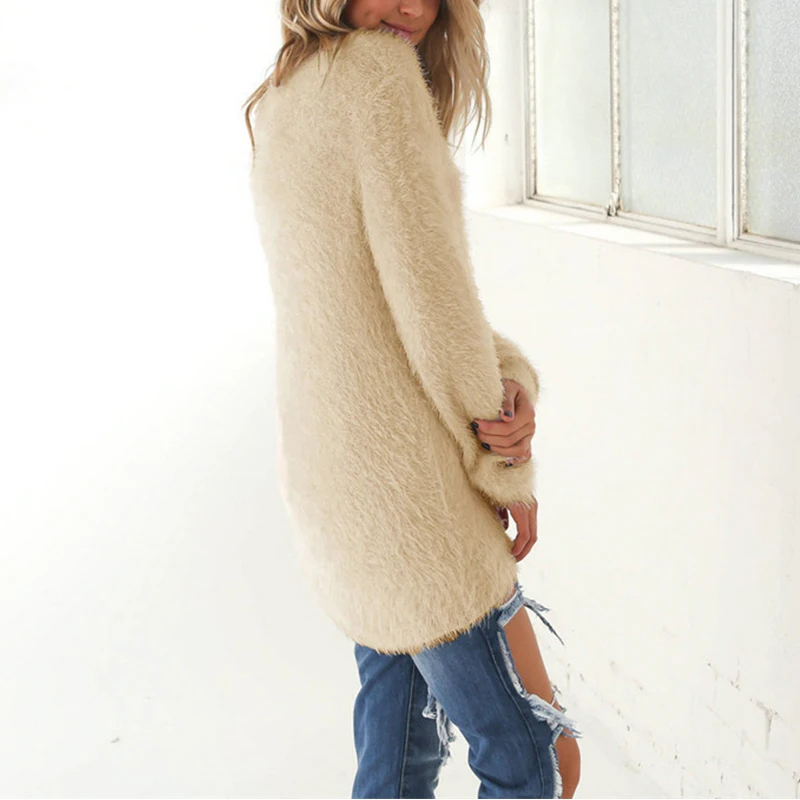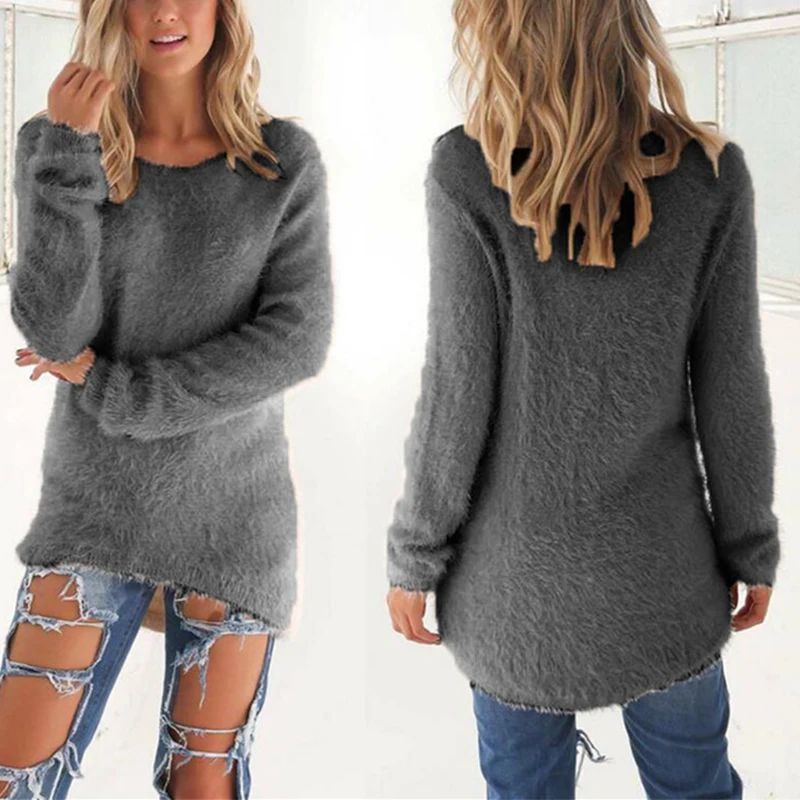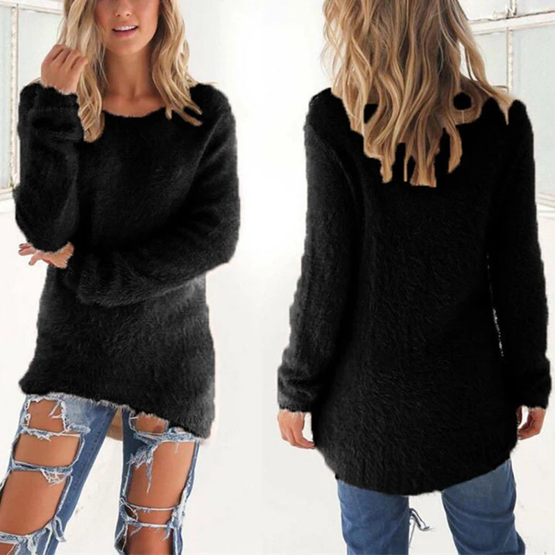 Женский вязаный свитер, длинный пуловер, Повседневная теплая однотонная кофта розового и черного цветов с круглым воротником, для осени и зимы