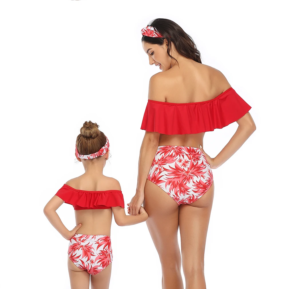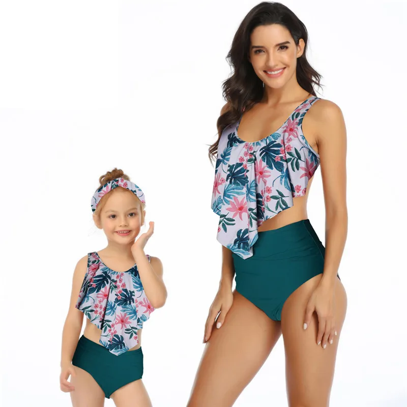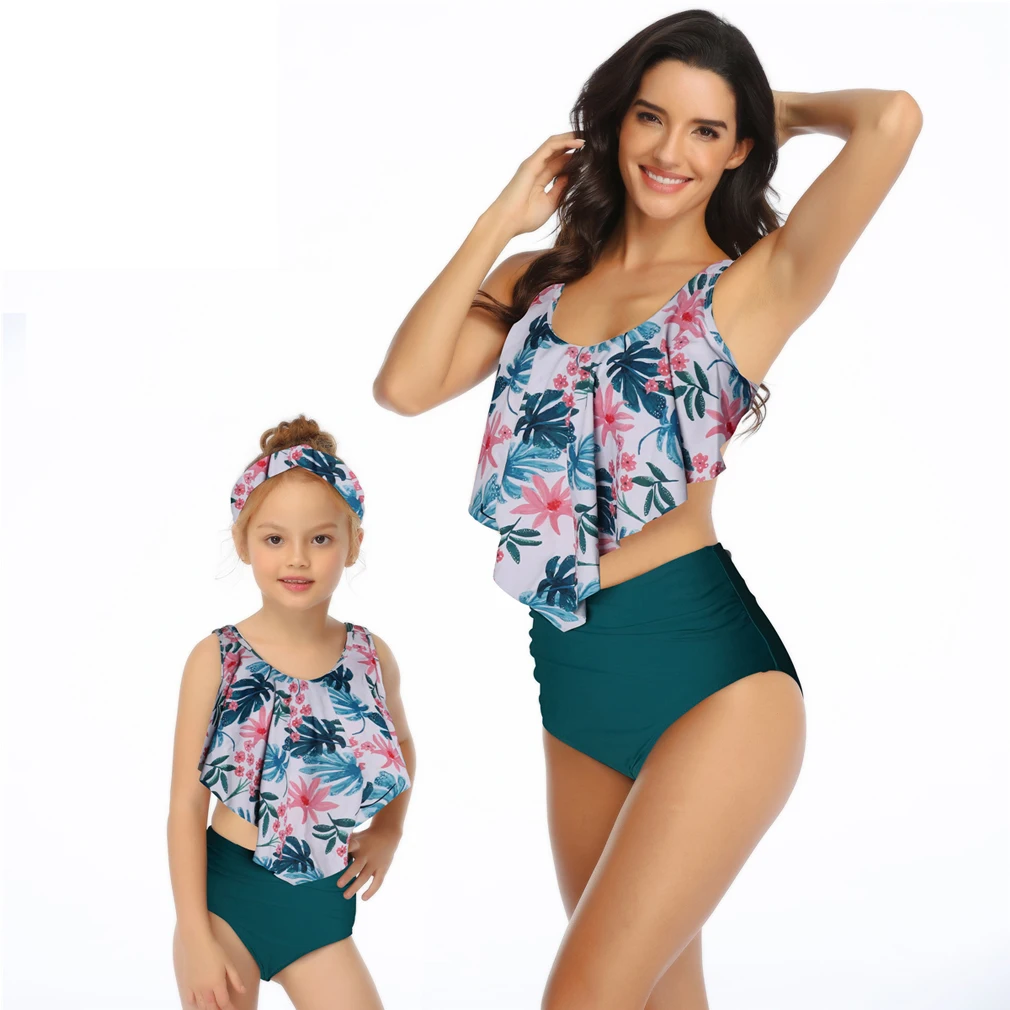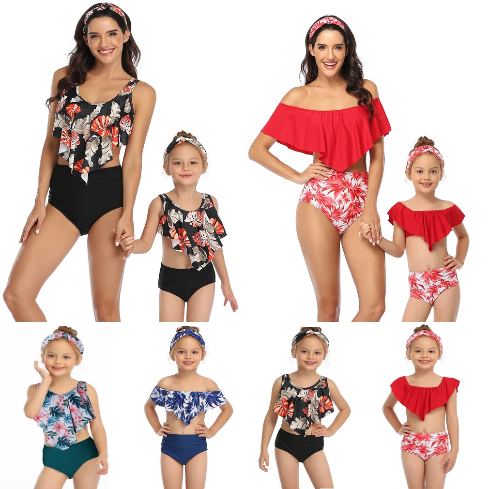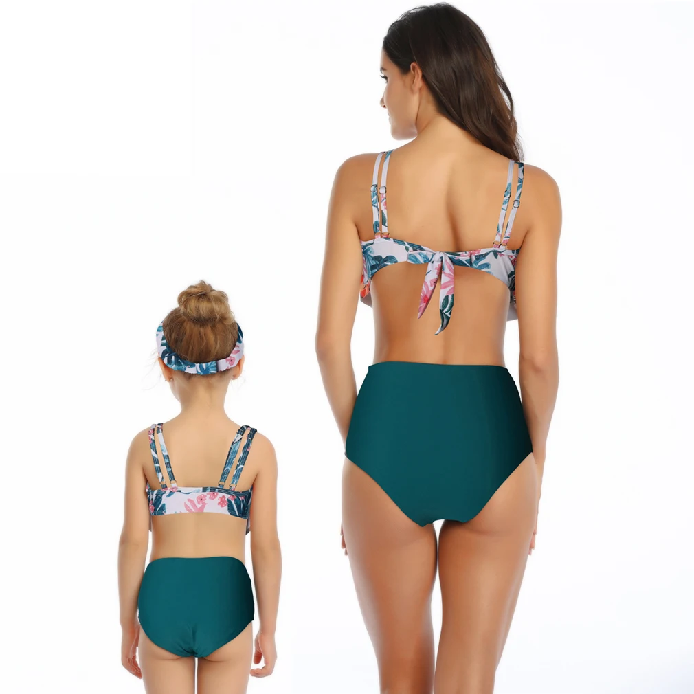 Одежда для купания для родителей и детей; женское детское бикини; коллекция 2020 года; семейный купальный костюм с высокой талией для мамы и дочки; пляжная одежда с цветочным принтом