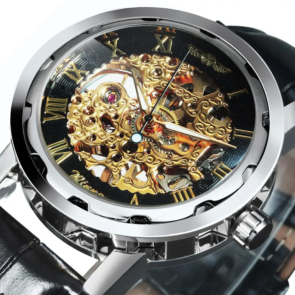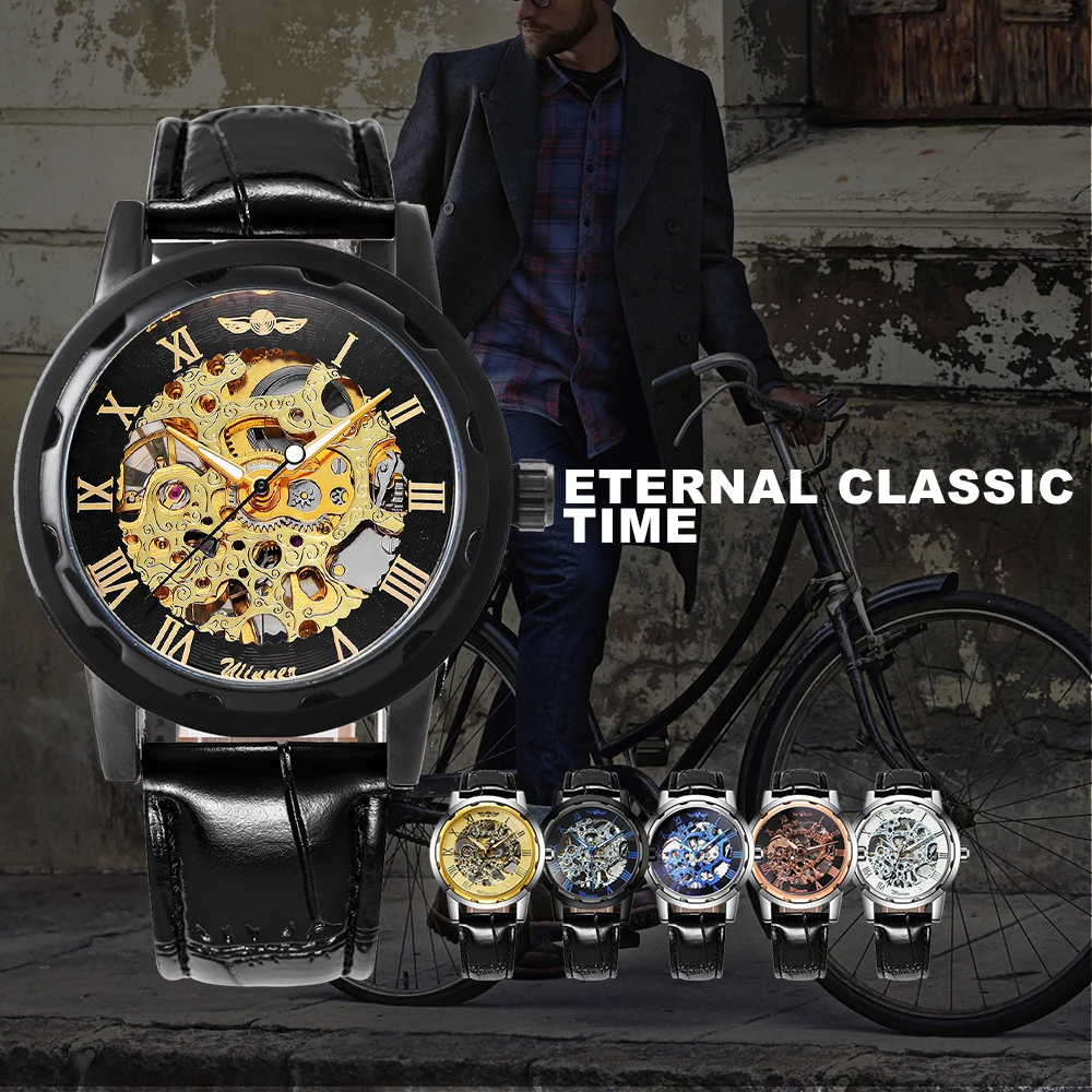 Часы наручные WINNER Мужские механические, брендовые Роскошные с гравировкой, с кожаным ремешком, классические, золотистые