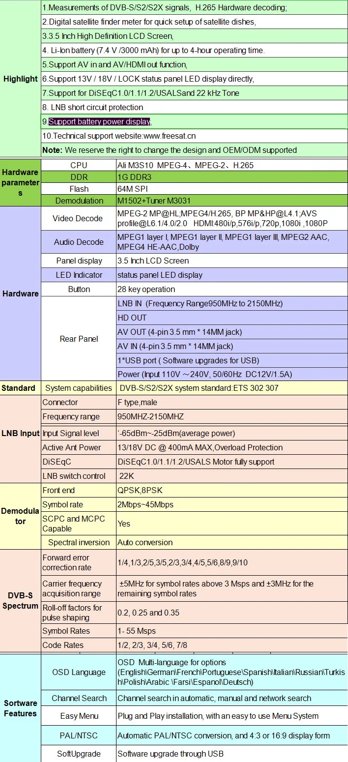 1. Измерения сигналов DVB-S/S2/S2X, аппаратное декодирование H.265; 2. Цифровой спутниковый искатель для быстрой установки спутниковой антенны, 3,5-дюймовый ЖК-экран высокой четкости, 4. Литий-ионная аккумуляторная батарея (7,4 V /3000 mAh) для до 4 часов рабочего времени. 5. Поддержка AV in и AV/HDMI out, 6. Поддержка 13V / 18V/статус блокировки панели светодиодный дисплей Прямая поставка от производителя 7. Поддержка DiSEqC1.0/1,1/1,2/USALSand 22 kHz тон 8. LNB защита от короткого замыкания 9. Поддержка дисплея питания аккумулятора, 10. Веб-сайт технической поддержки: www.freesat.cn