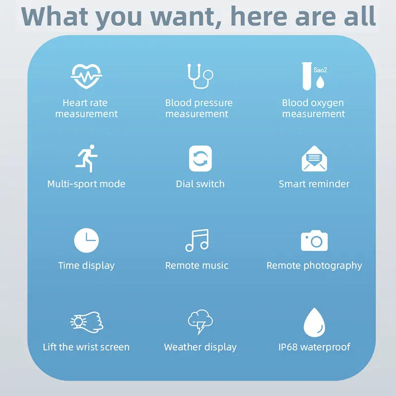 -Основные функции: мониторинг сердечного ритма, Мониторинг Артериального давления/кислорода в крови, мониторинг сна, напоминание о малоподвижности, мульти-спортивное измерение, часы, будильник и несколько языков.