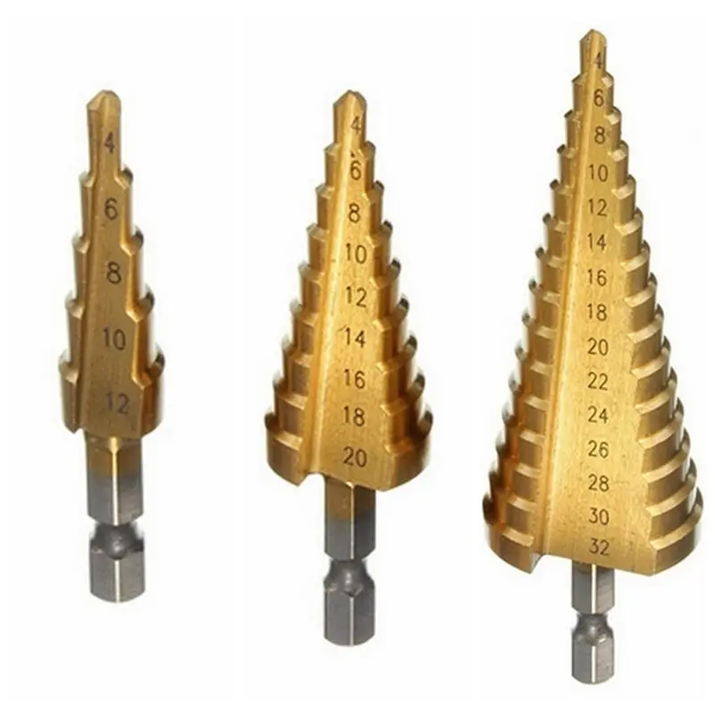 Это новая быстрорежущая сталь с большим шаговым Конусным сверлом, титановый набор сверл, который сделан из высококачественной быстрорежущей стали и с титановым покрытием, чтобы уменьшить трение и тепло