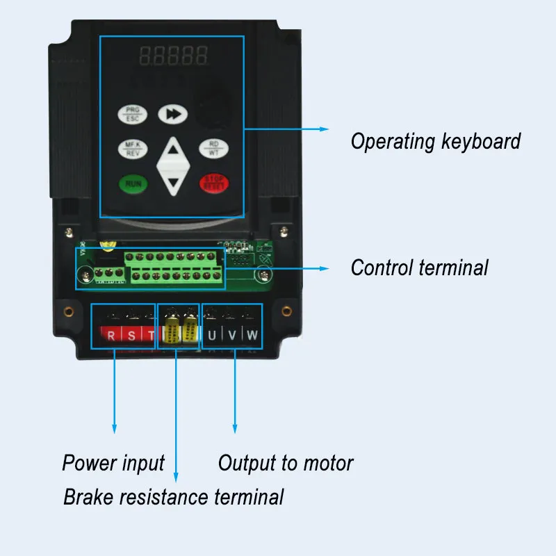 U, V, W являются выходными клеммами преобразователя частоты и подключен трехфазный асинхронный двигатель.P и P B являются соединительными клеммами тормозного сопротивления.