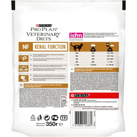 Pro Plan Veterinary Diets NF Renal Function для кошек при патологии почек.Преимущества корма:Ограниченное содержание пищевого фосфата.Ограниченное количество высококачественных белков.Показания:Хроническая почечная недостаточность (ХПН).Профилактика повторного образования уратов и цистинов.Снижение частоты появления уратов и цистинов.Противопоказания:Рост и репродукция.