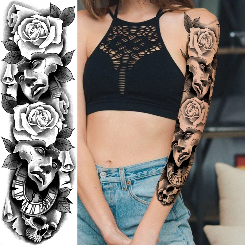 Длинные полные руки Временные татуировки реалистичные поддельные черный Гангстер пистолет роза татуировки рукава угол Татуировка воина наклейки для женщин мужчин