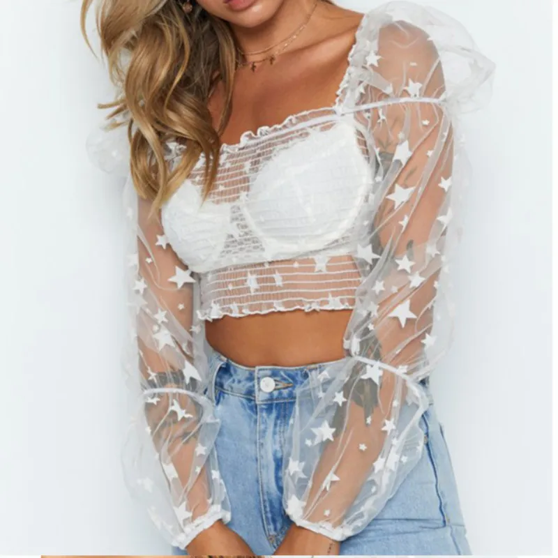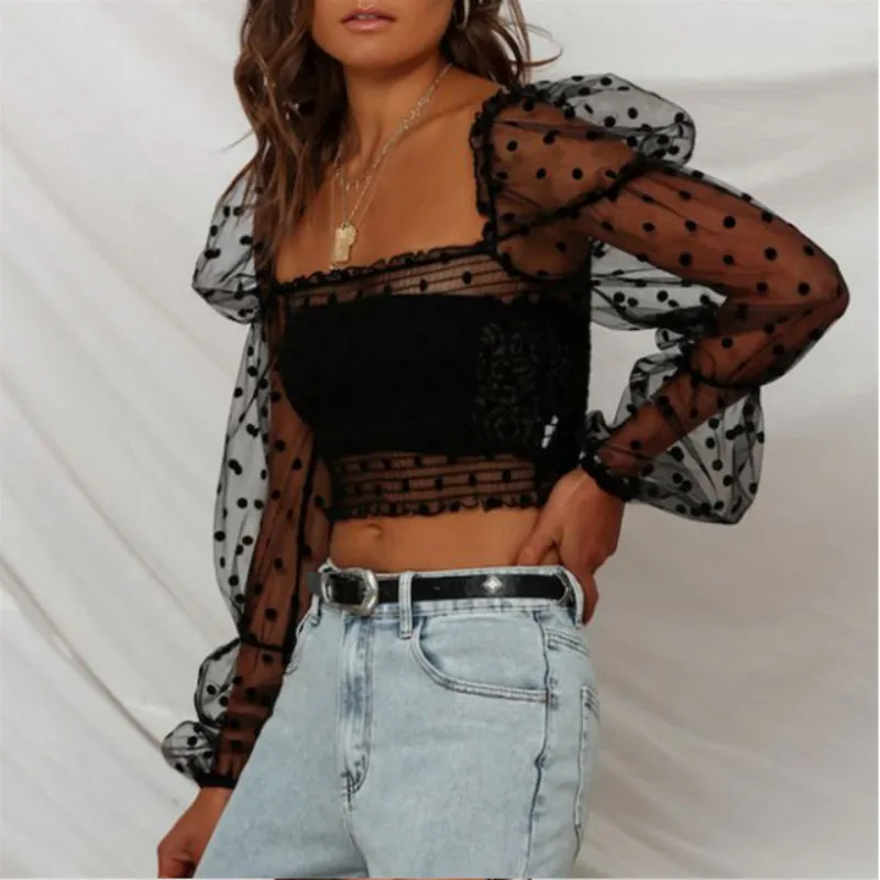 Женская кружевная блузка, с квадратным вырезом и прозрачными рукавами-фонариками, уличный пляжный эластичный Топ в горошек для отпуска