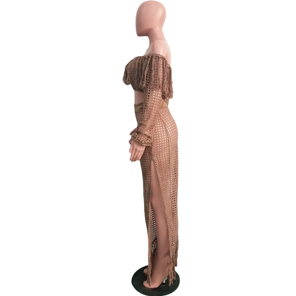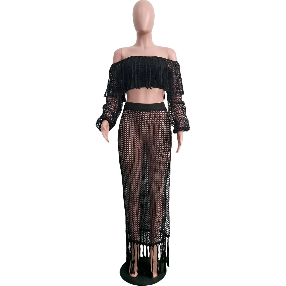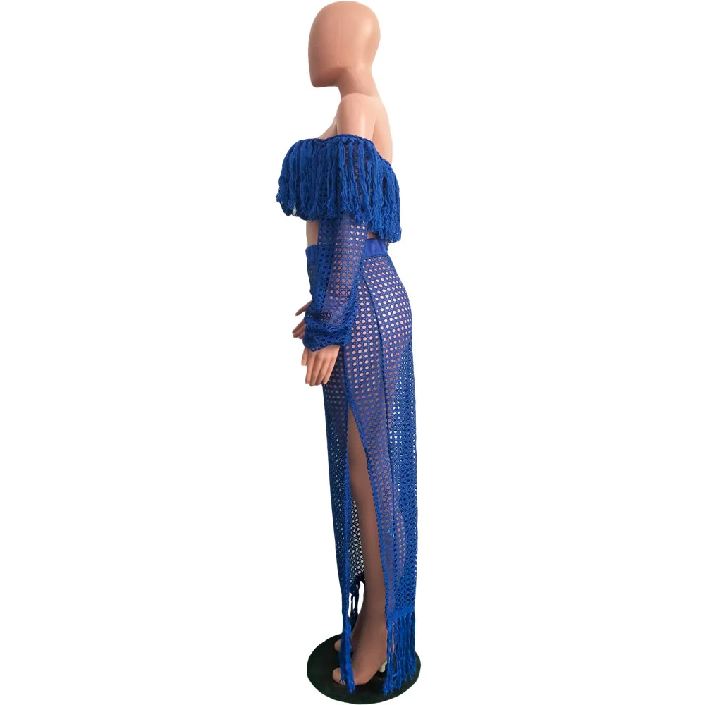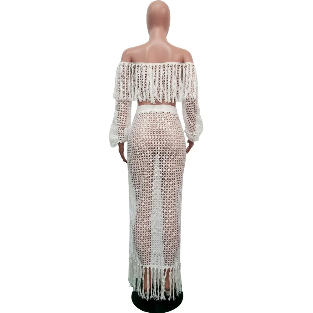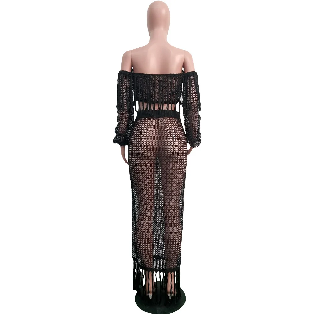 Платье женское трикотажное пляжное с бахромой, вязаная туника, пикантная пляжная одежда с открытыми плечами и длинным рукавом, с разрезом, в богемном стиле, лето 2020