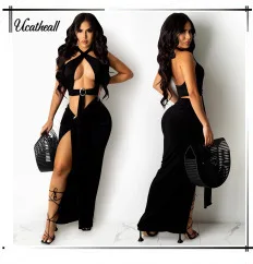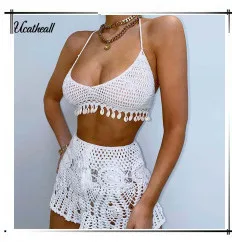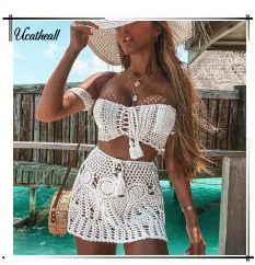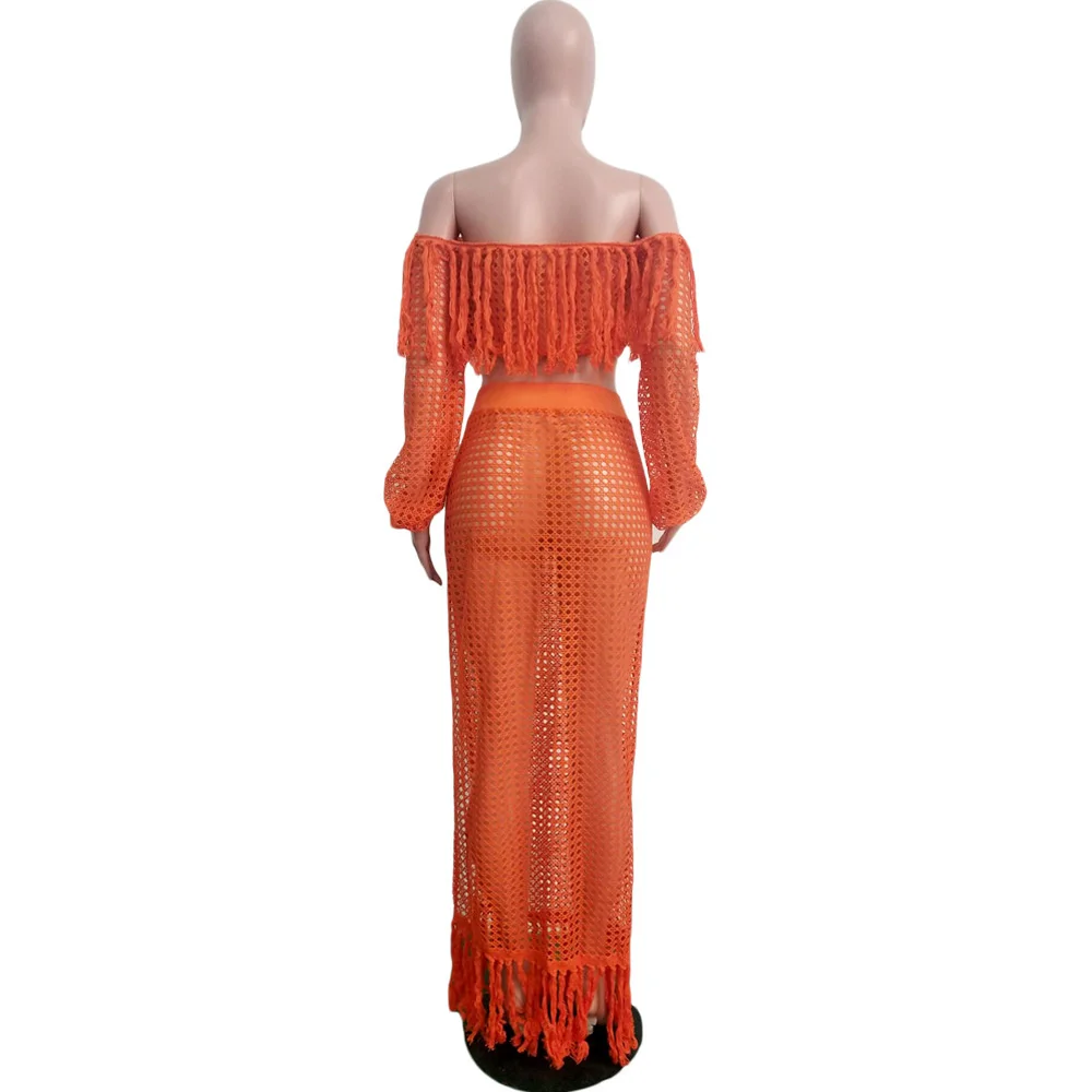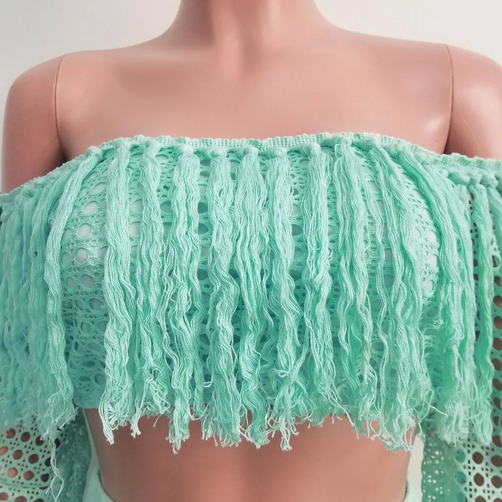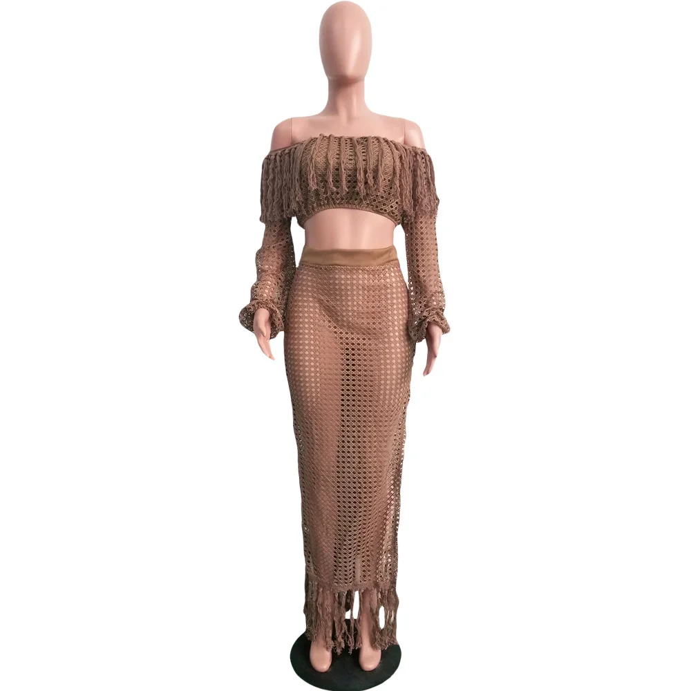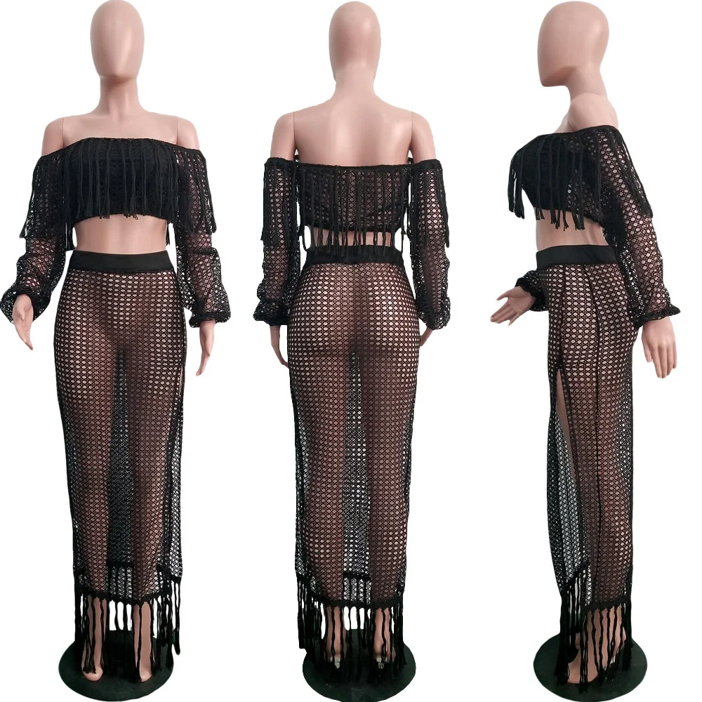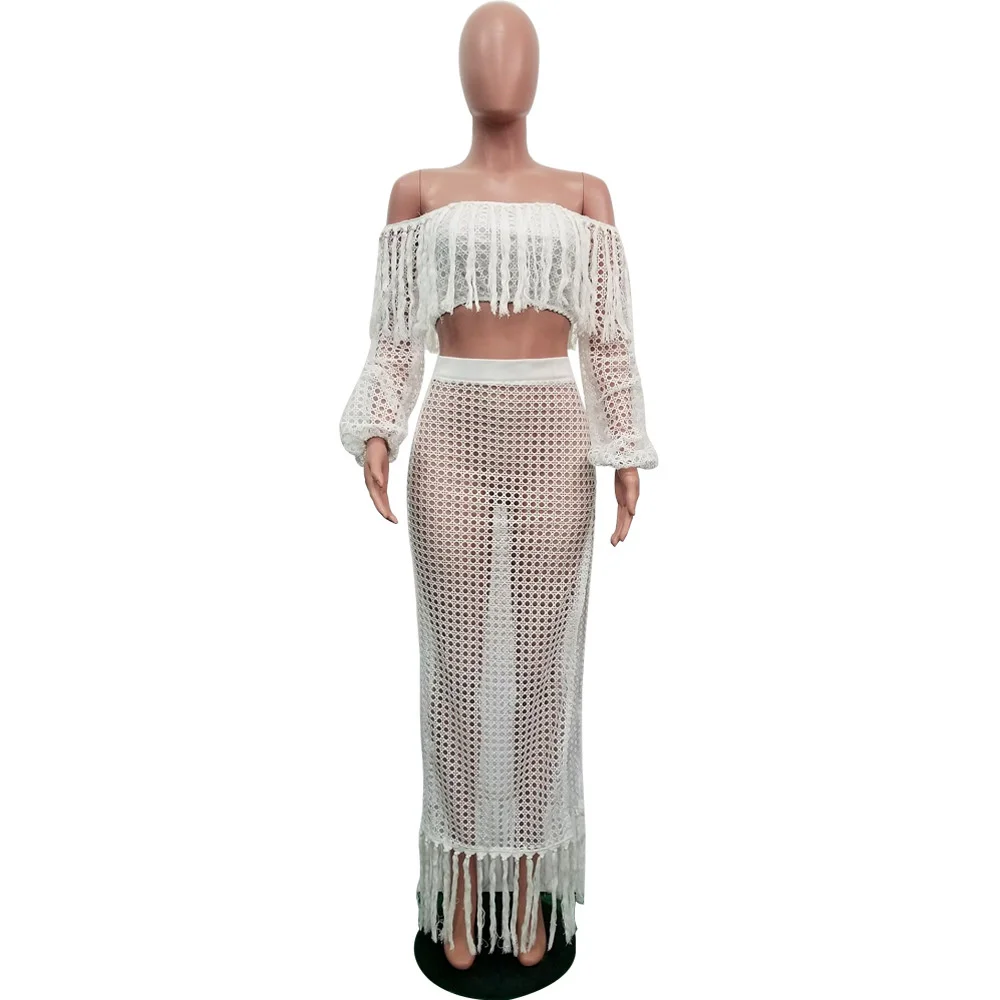 Платье женское трикотажное пляжное с бахромой, вязаная туника, пикантная пляжная одежда с открытыми плечами и длинным рукавом, с разрезом, в богемном стиле, лето 2020