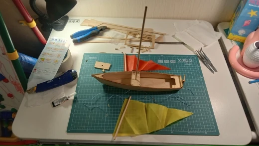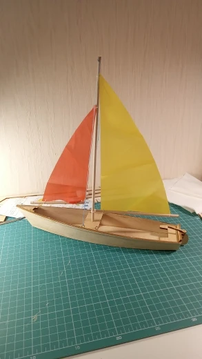 Довольно неплохая модель лодки. деталей совсем не много, сборка лёгкая. в наборе даже лежит клей. но есть несколько претензий. 1) упаковка мягкая, модель плохо выдержала транспортировку. несколько деталей были сломаны. к счастью, удалось починить, но всё же грустно. 2) основная мачта кривая до ужаса. кое как удалось её привести в адекватное состояние, но небольшое искривление осталось.