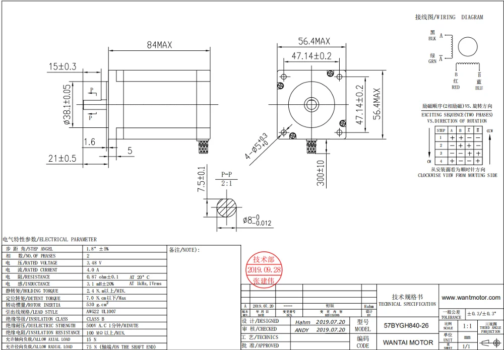 Шаговый двигатель Wantai 1PC Nema23 57BYGH840-26 4.0A 340oz-in 84 мм 4-lead CE ROHS ISO CNC Router 3040